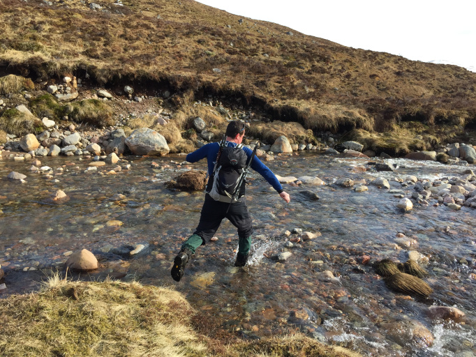 Several glissade techniques were on display as the group headed down to the col between Albainnaich and Ghlas Bheinn Mhor and then finally headed back out to Glen Etive down the (mostly boggy) path past The Robbers Waterfall. Paul and Raymond had ample opportunity to bask on the rocks by the burn as they waited for the slower paced James and Norrie to catch up.