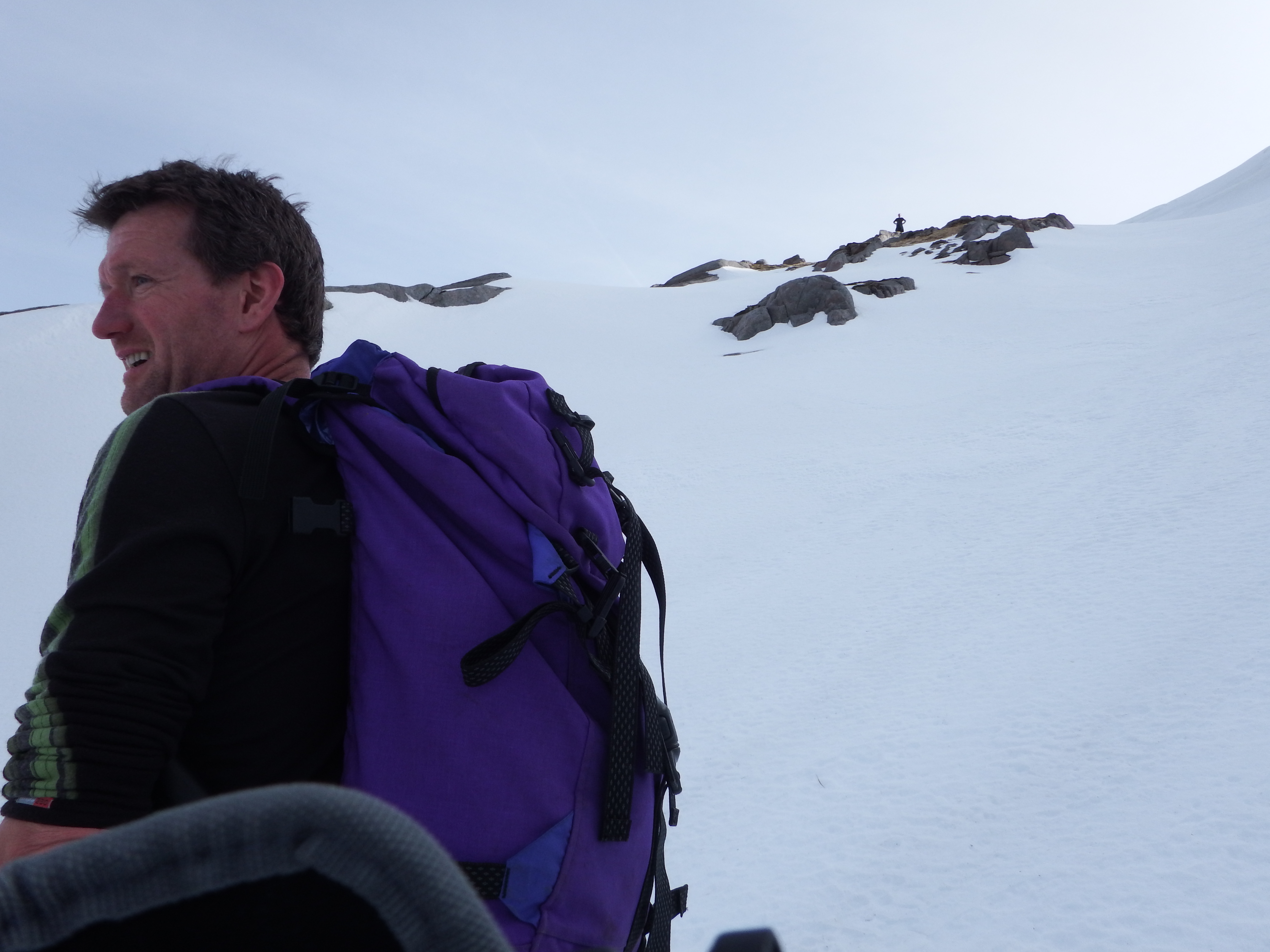 Once Norrie’s “Elvis Leg” returned to normal the quartet carried on up the fairly steep east ridge to the magnificent summit. The views were nothing short of sensational with blue skies and sun-kissed snow covered mountains in every direction.
