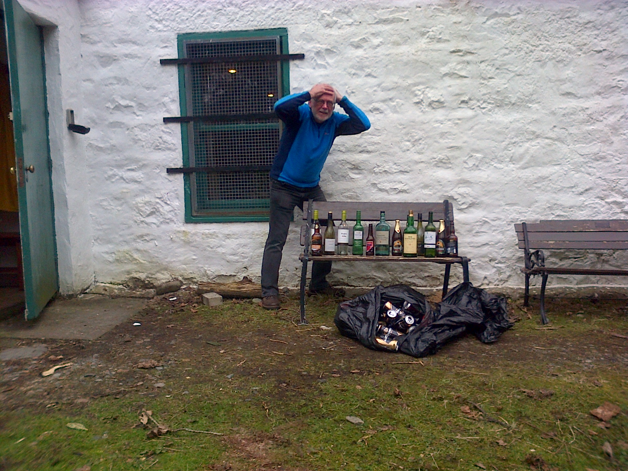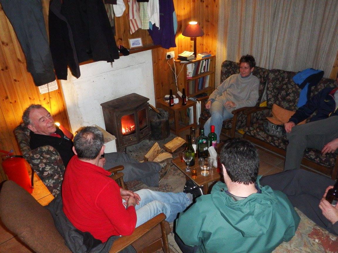 James, Norrie and George had met Rowena and Alastair in a Perthshire bothy in December and invited them along to the club meet. They clearly had some idea what to expect as they arrived with a case of beer, a bottle of Glen Livet 12 year old and a selection of song lyrics that they had printed out. Being a bit less experienced on the hills than the five club members, they were treated (if that is the right word) to quite a few tales of derring-do and disaster-dodging from the members’ previous exploits on the Scottish mountains. In accordance with custom the guitar appeared again and once more the vocal chords were exercised, stretched and strangled for the next couple of hours.