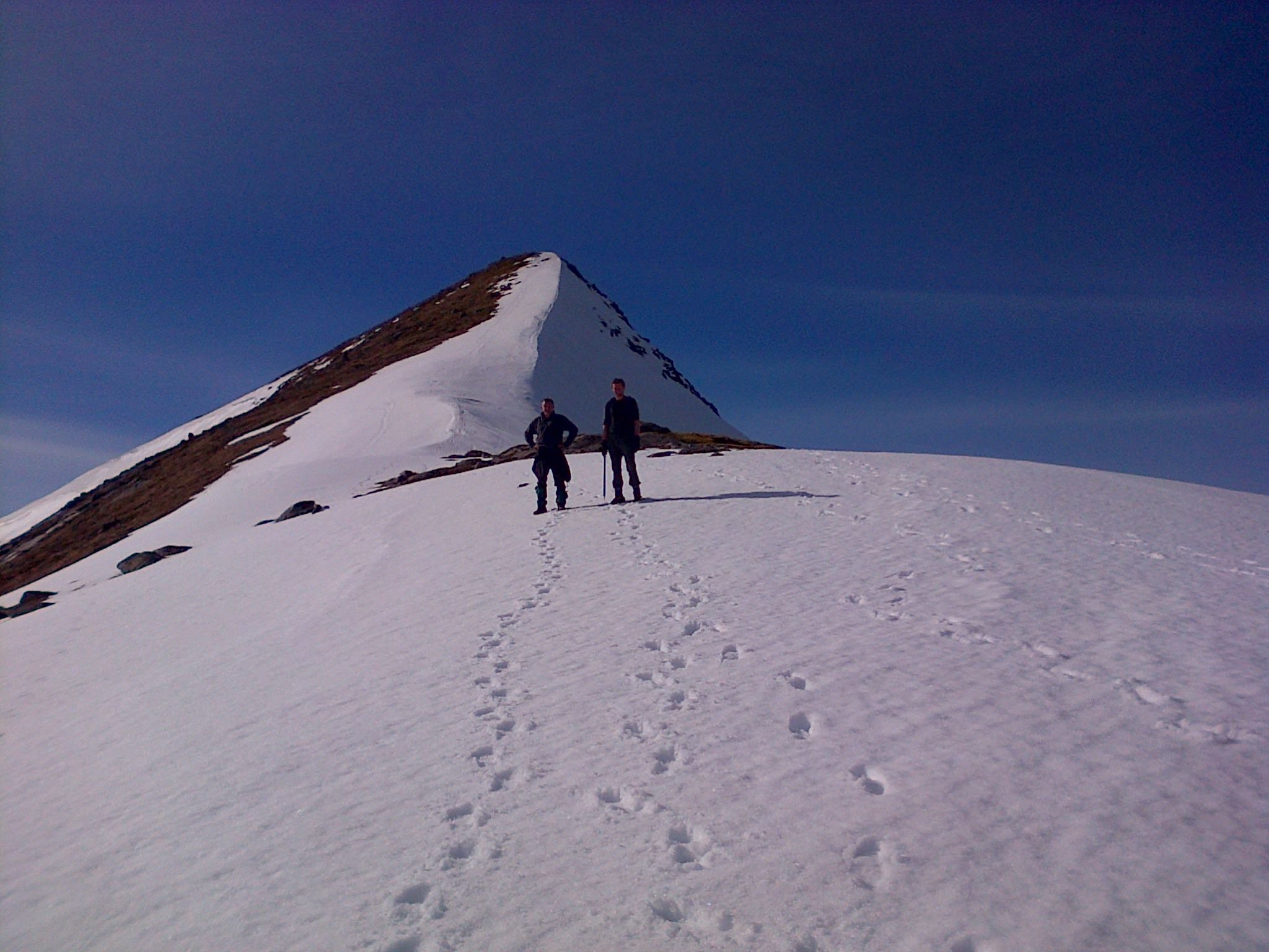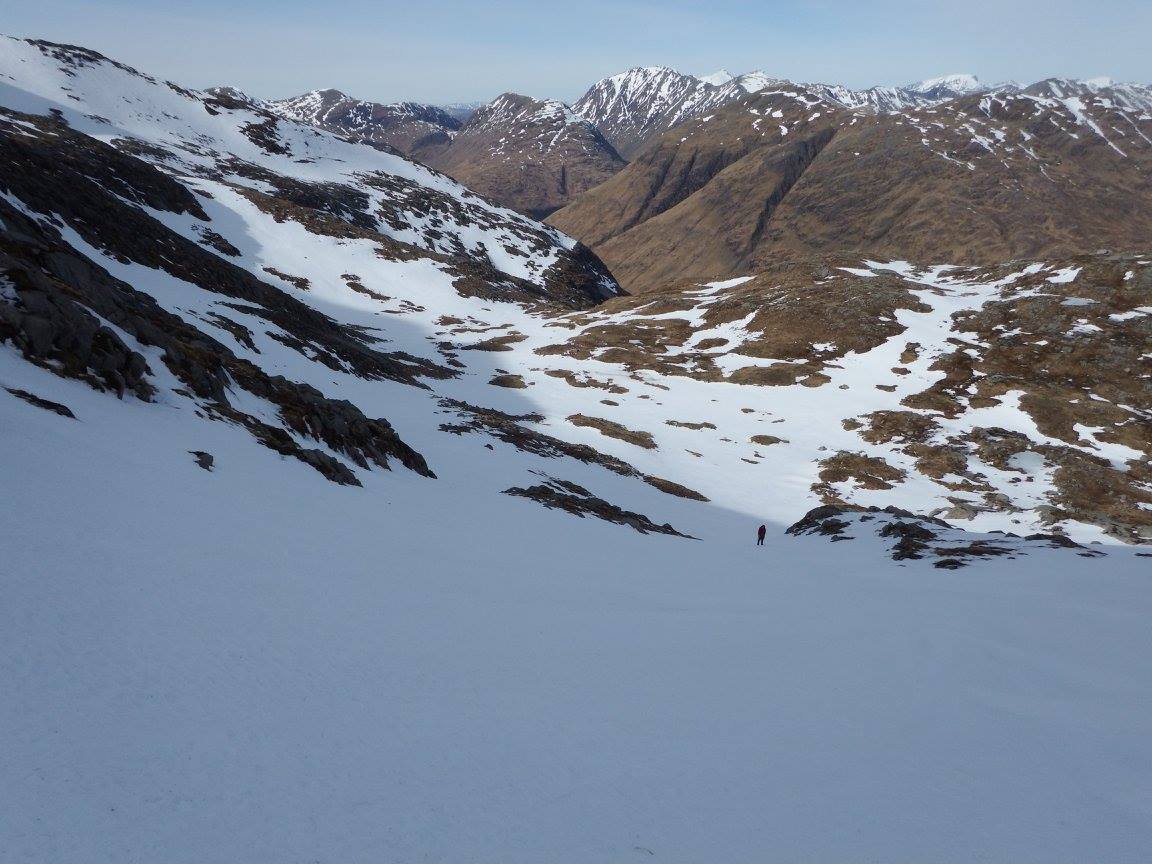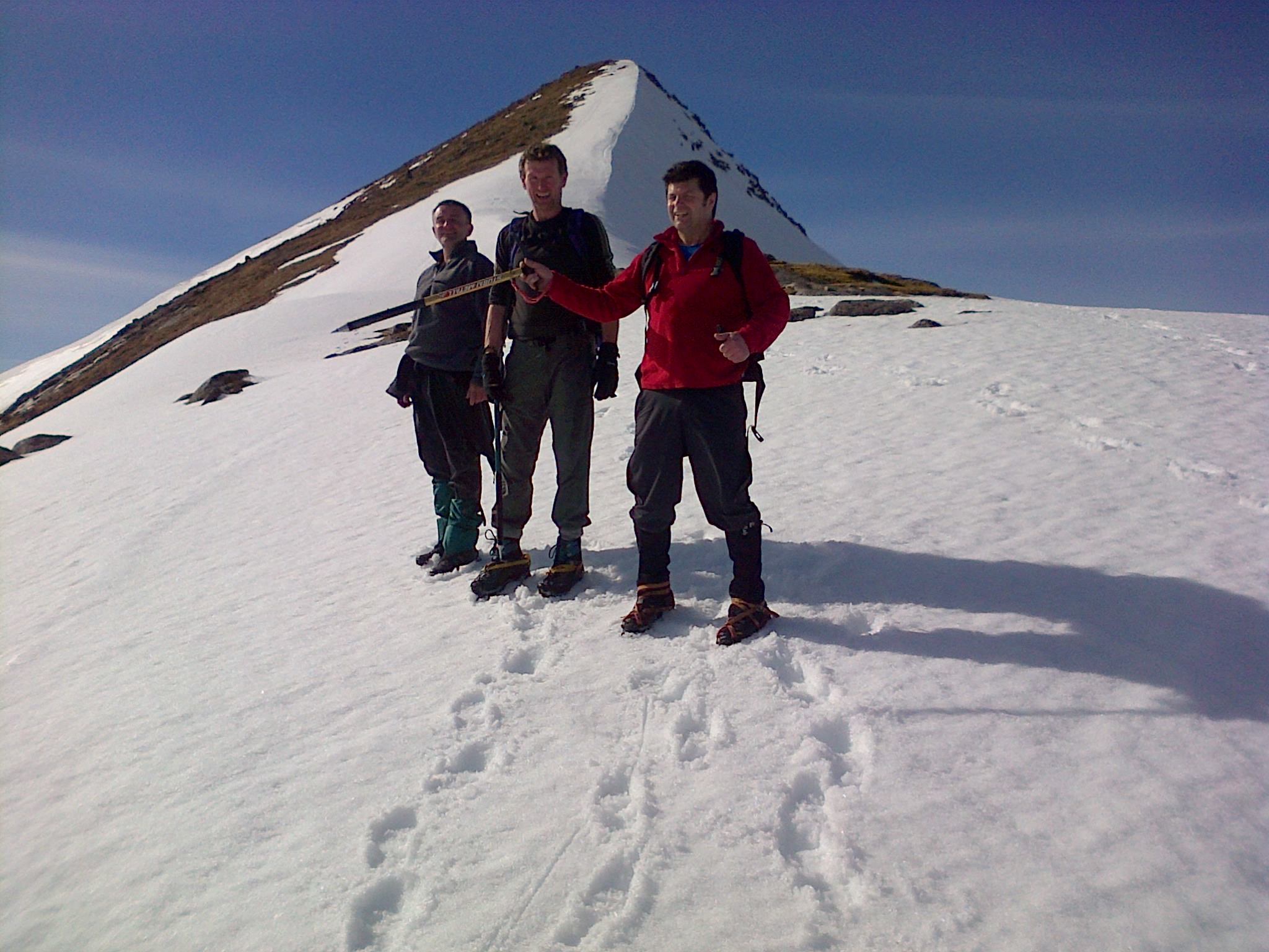 Raymond, James and Norrie decided to don crampons and head up a long snow filled north facing gully up onto the main Albainnaich ridge. Paul who was “travelling light” took a rockier route to the east of the gully. The snow was hard packed but the going was very enjoyable up until a final 20 foot ice wall at an angle of maybe 75 degrees. Raymond cut some steps to aid Paul’s ascent and following behind Norrie discovered that his micro crampons were not really designed for that sort of angle. After a couple of inelegant ice-axe arrests he finally succeeded in attaining the ridge and James followed on shortly afterwards.
