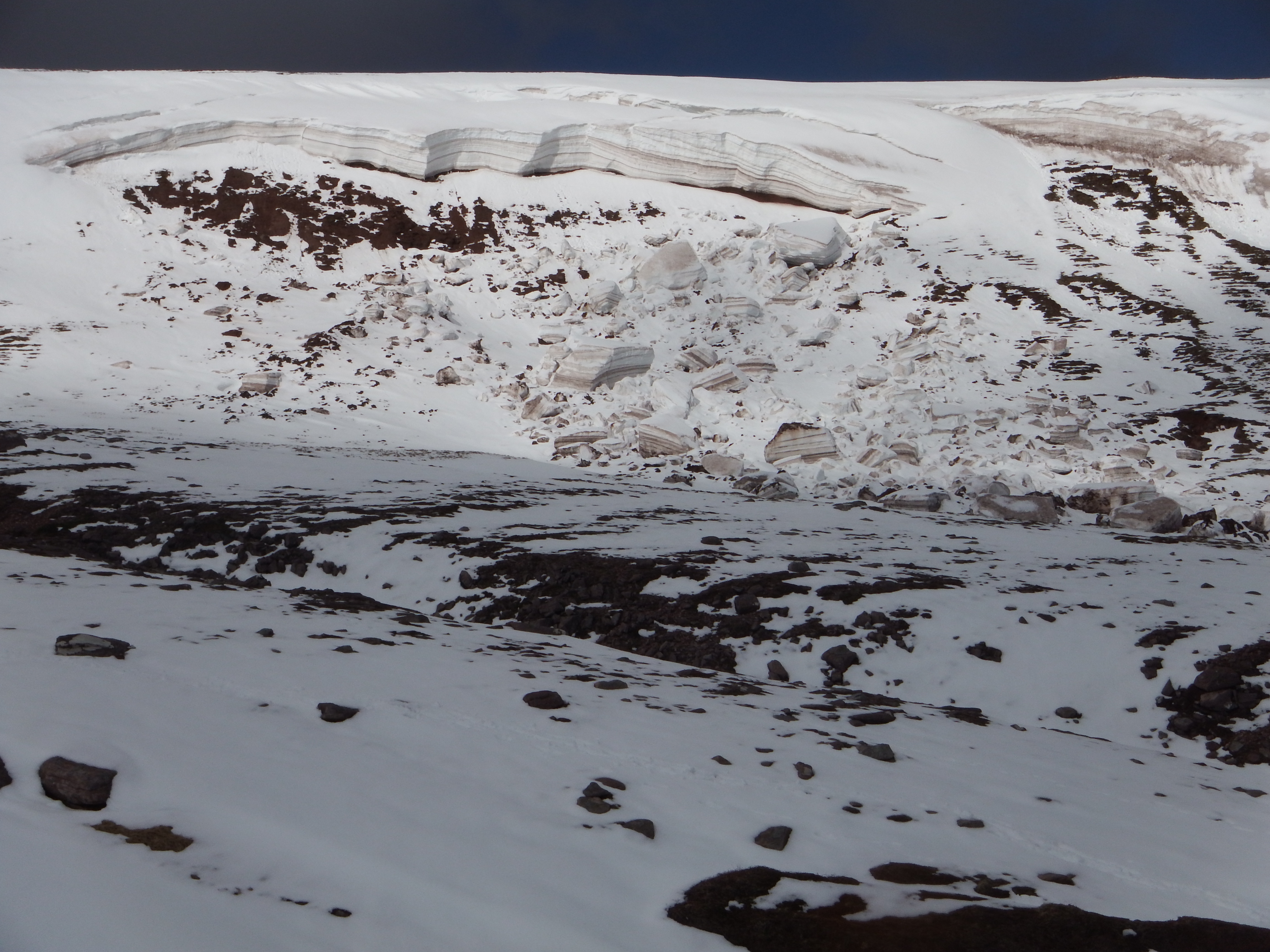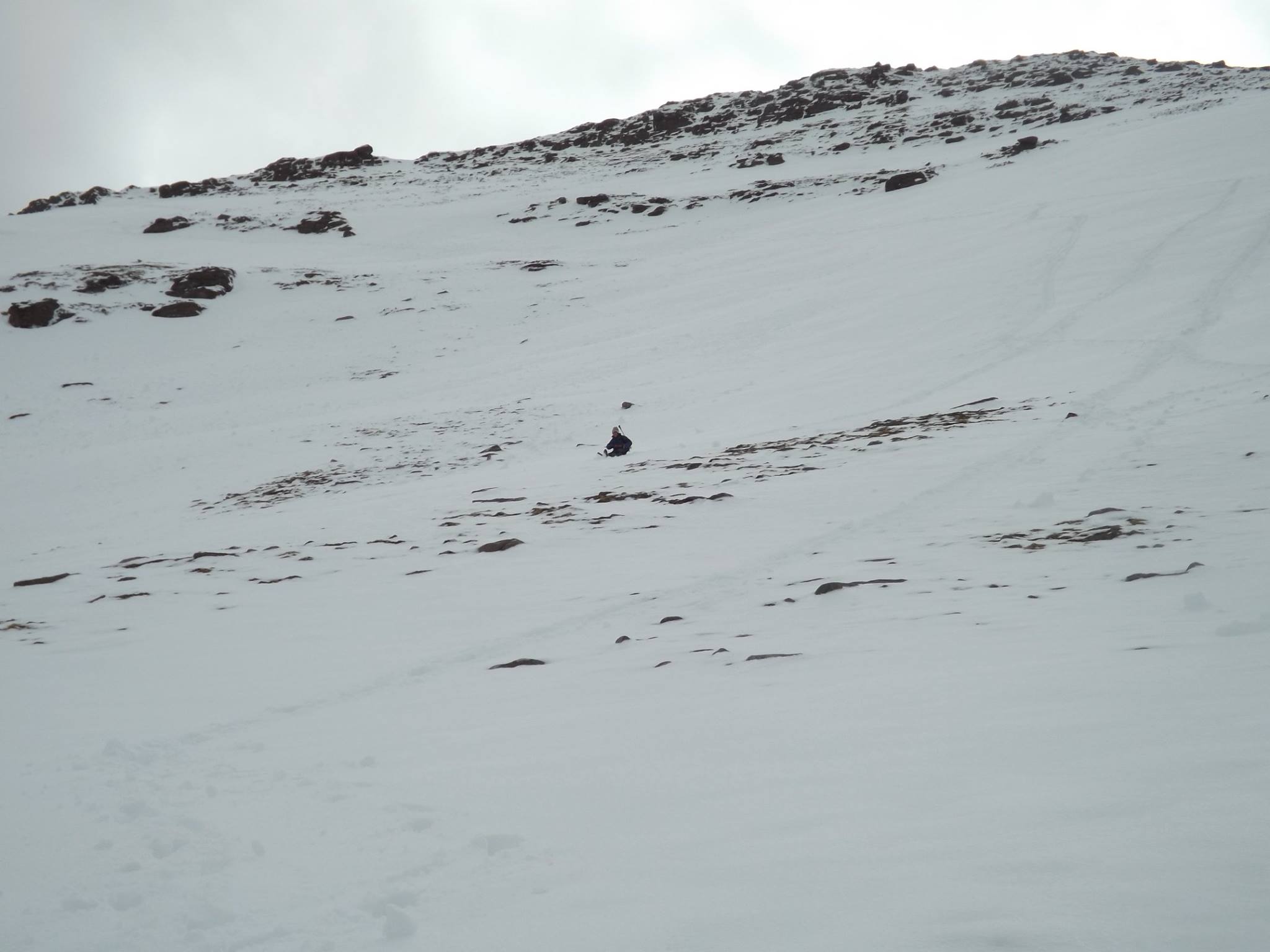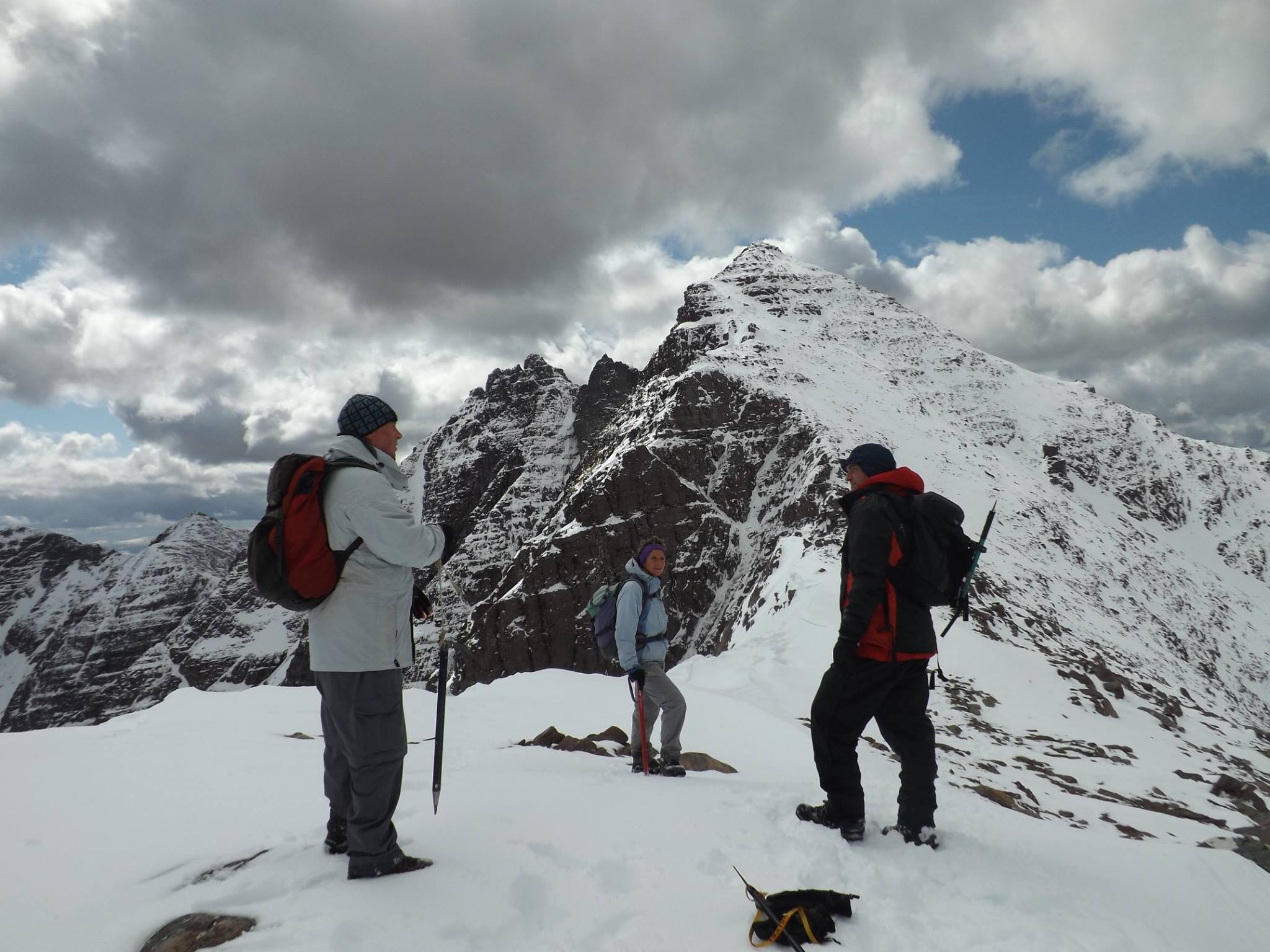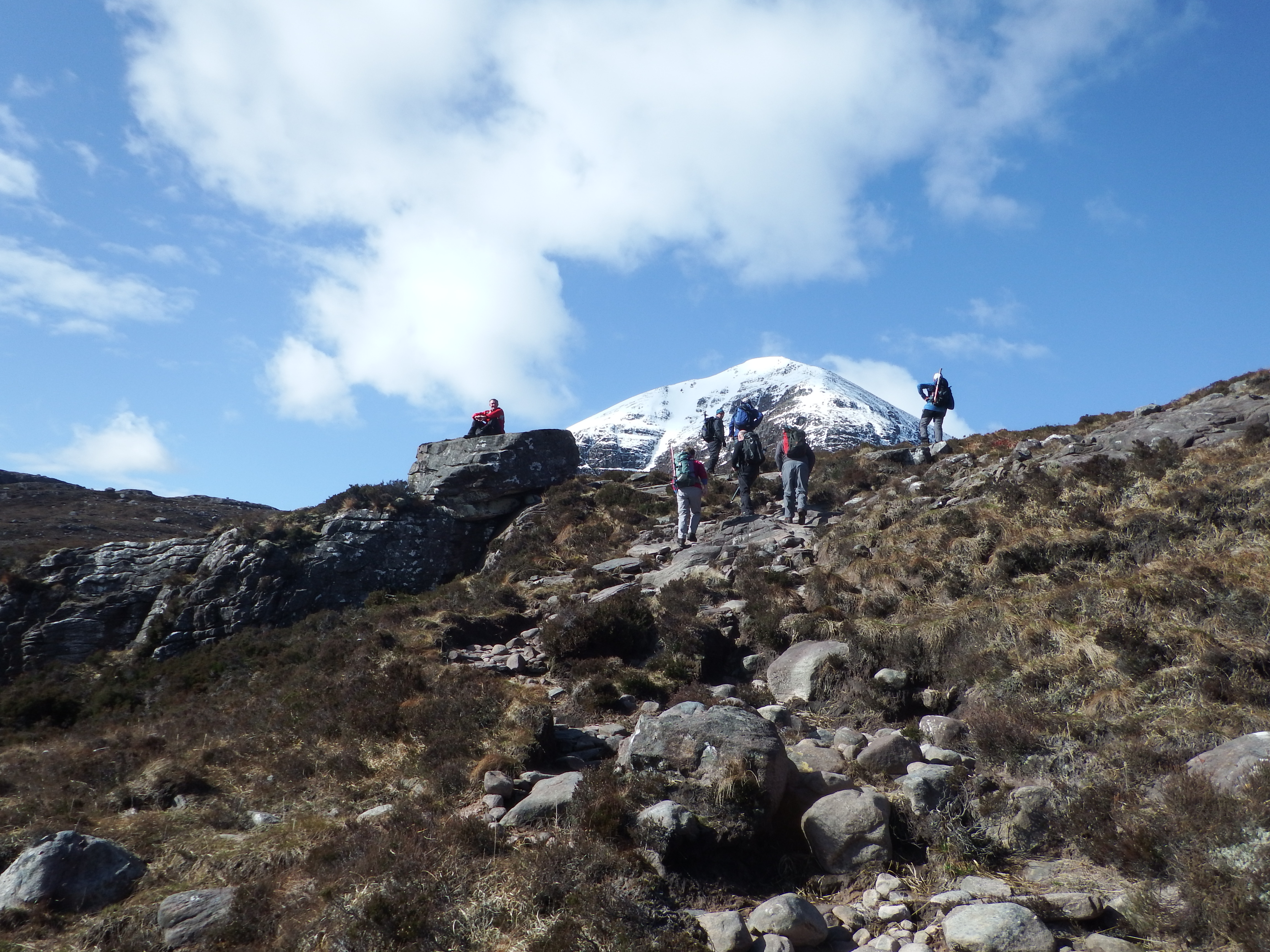 Saturday greeted us with magnificent sunshine and the eager group were heading for the hill before 8.30. The path up from Dundonnell wasn’t as boggy as some had feared and it was pretty easy going up the Glas Tholl to the snow line at around 500m metres. A glance across to the north side of the corrie revealed some gargantuan snow blocks the result of an earlier avalanche – a reminder, if one was needed, of the care required in the Scottish mountains.