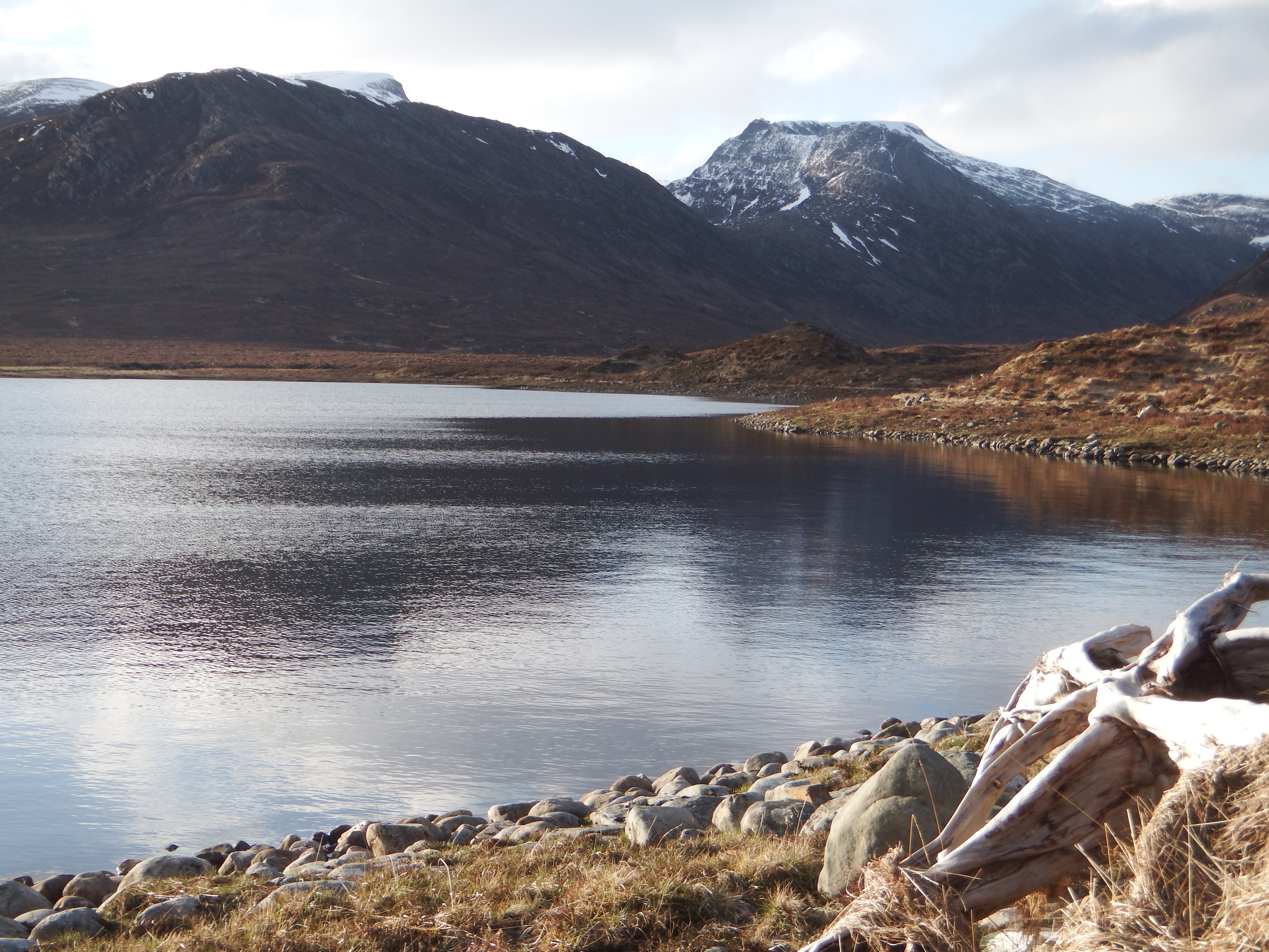 The climb to the summit is very easy-angled and they were soon on top admiring the vista. George and Susan were keen to carry on to the Munros of Cona’ Mheall and Beinn Dearg. Neil and Norrie were undecided but headed down with them anyway to the wonderfully remote Loch Prille. The walk back from there looked unappealing so all four headed for the eastern ridge of Cona’ Mheall. A few hundred metres from the top conditions became a bit tricky with soft new snow sitting on an icy layer. Neil and Norrie decided to retreat at that point and headed back in the direction of Loch Prille before descending carefully to the Allt Lair and the long trek back to the car in glorious early evening sunshine.