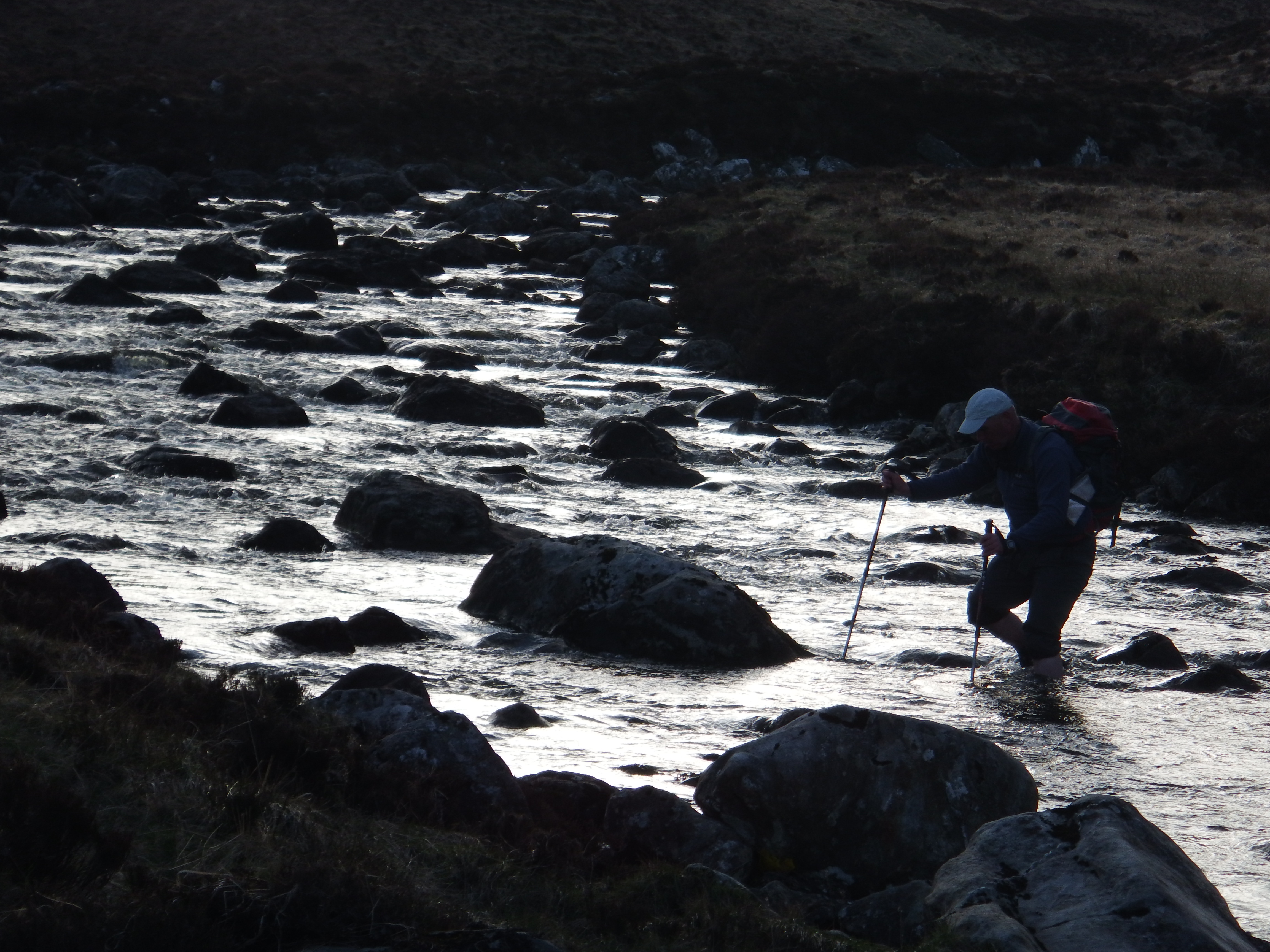 Also on Friday morning, Neil and Norrie met up with George and Susan in Inverness for breakfast (fried egg on a bed of lettuce anyone?) before heading west to the head of Loch Glascarnoch to climb the much maligned and much mispronounced Am Faoachagach. This Munro doesn’t feature on many calendars or biscuit tins but it is still well worth climbing for the excellent views and its sense of remoteness. A river crossing has to be negotiated on the ascent. Neil went off in search of the “Brigadoon Bridge” which may have existed in a previous century but certainly no longer did. Norrie’s inspired bin bag shuffle across the river proved to have been poorly researched while George and Susan managed to hop across some stones without getting their feet totally soaked.
