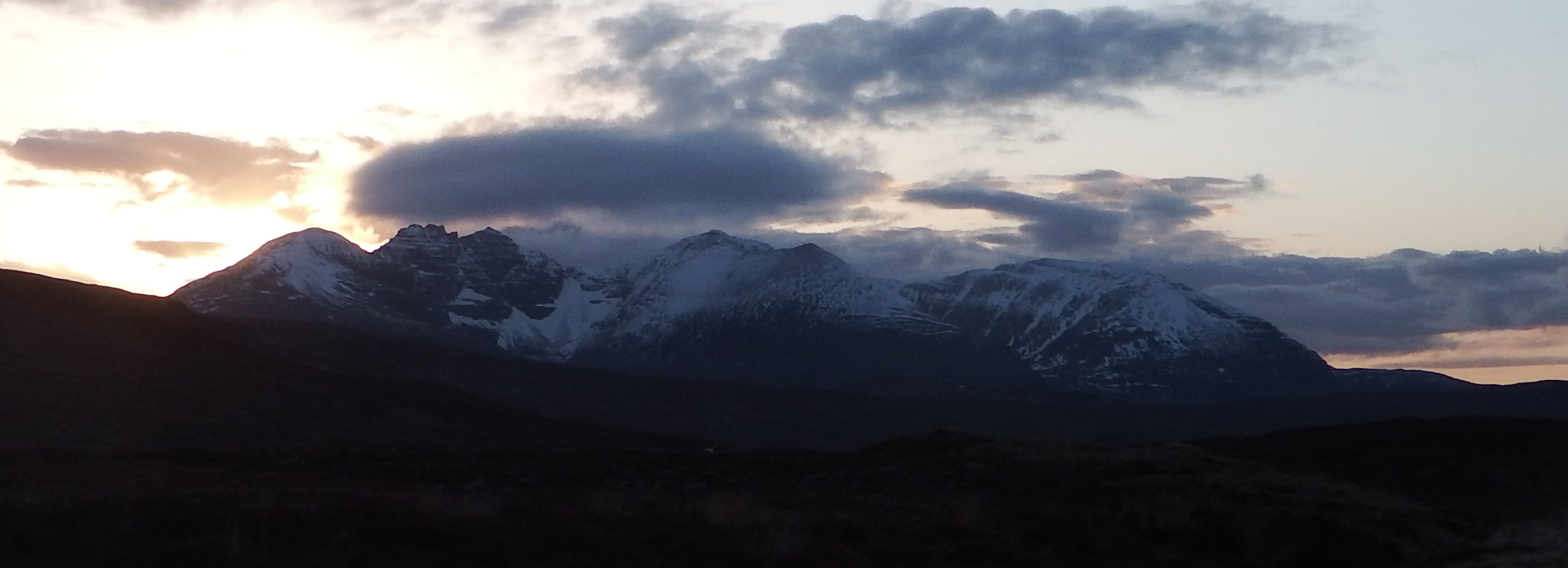 George and Susan successfully tackled the tricky ridge and attained the summit of Cona’ Mheall before heading on to Beinn Dearg and dropping down to the Allt a’ Gharbhrain arriving back at their car just before Neil and Norrie. The sun was setting behind An Teallach as they headed up towards The Smiddy.
