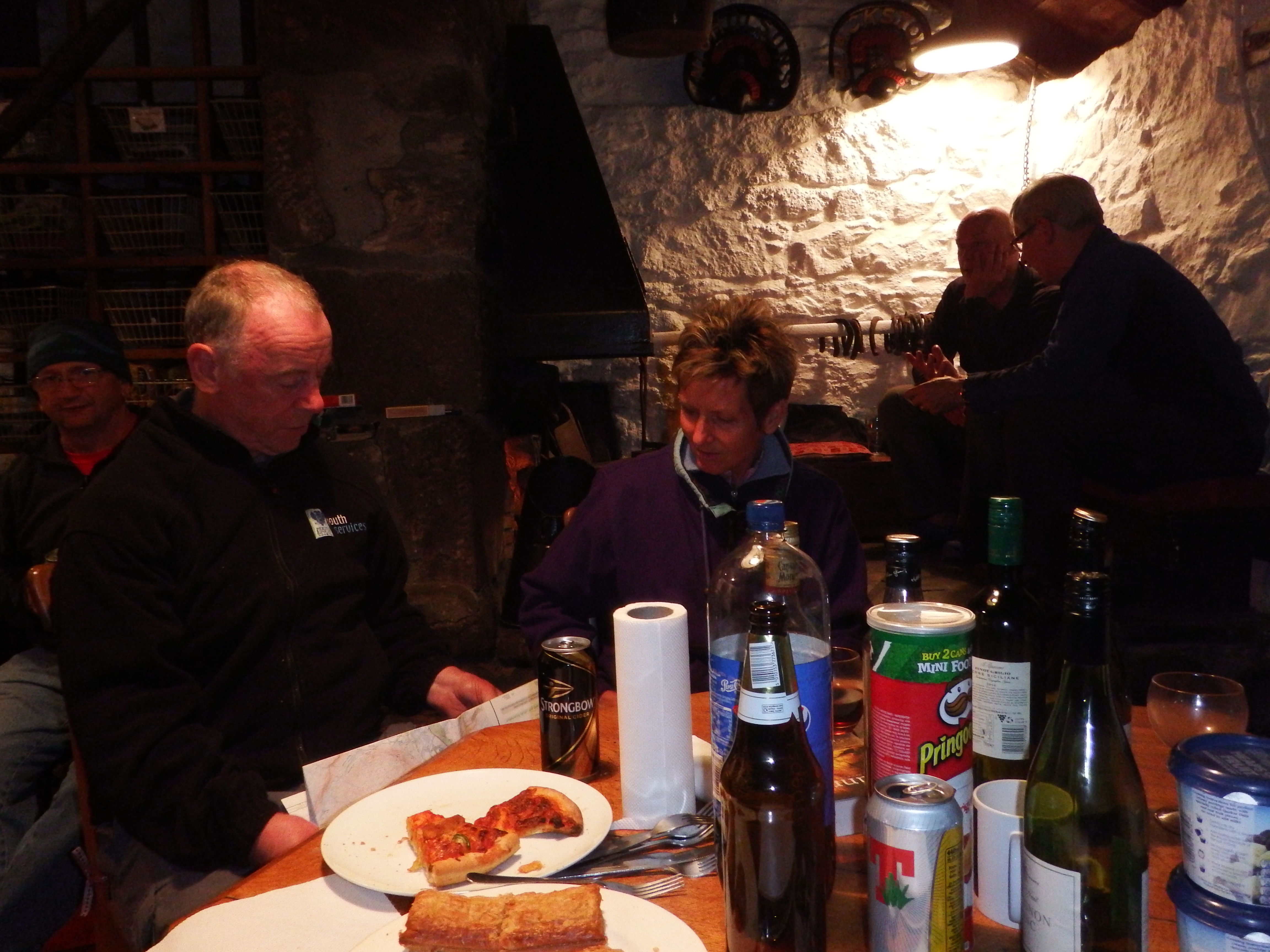 The others were all ensconced in the hut by the time they arrived at around 9.00 pm. The fire was going, glasses were filled and Masterchef Jim Aire supervised the heating of the pizzas and sausage rolls for the late arrivals.