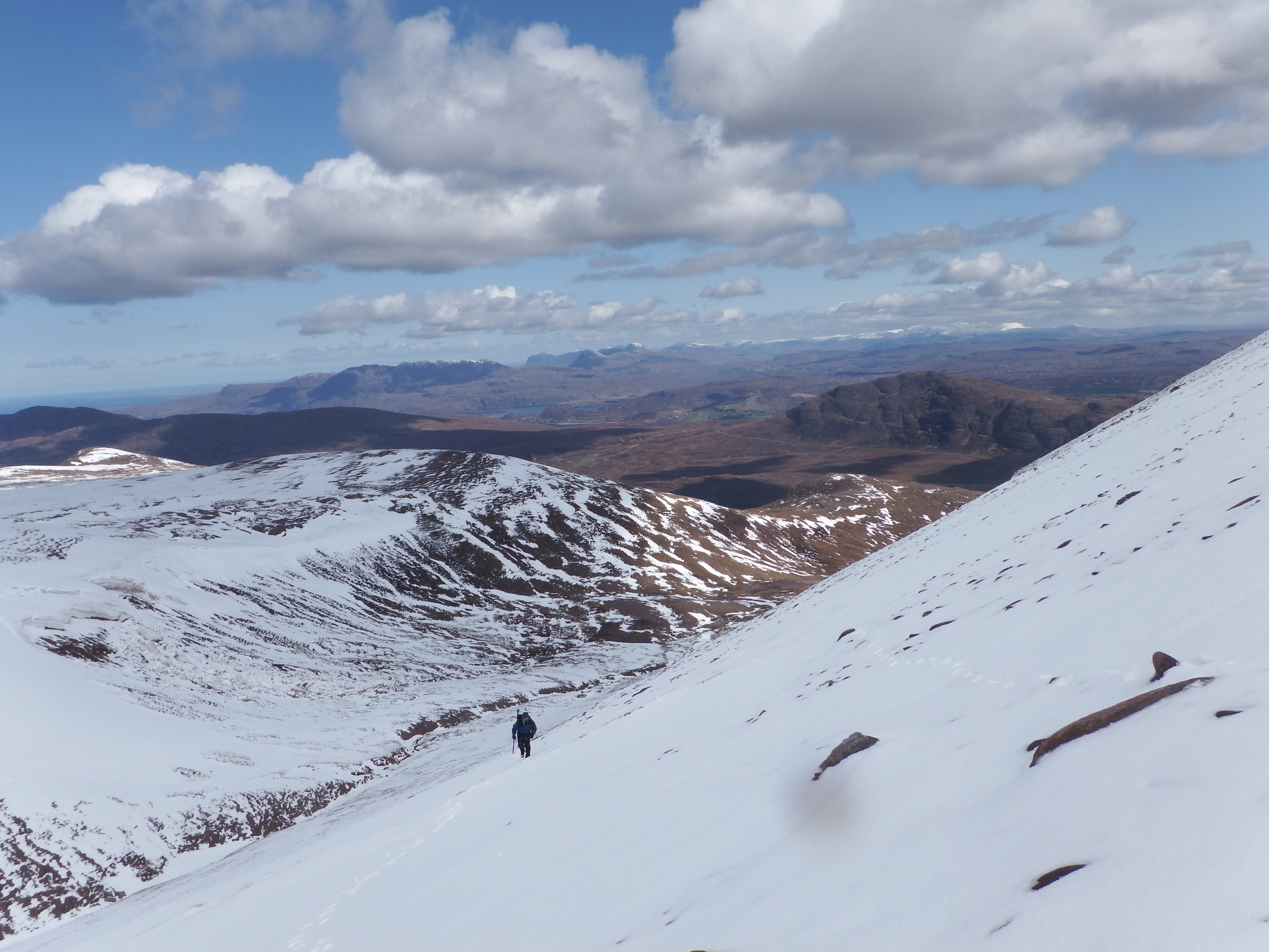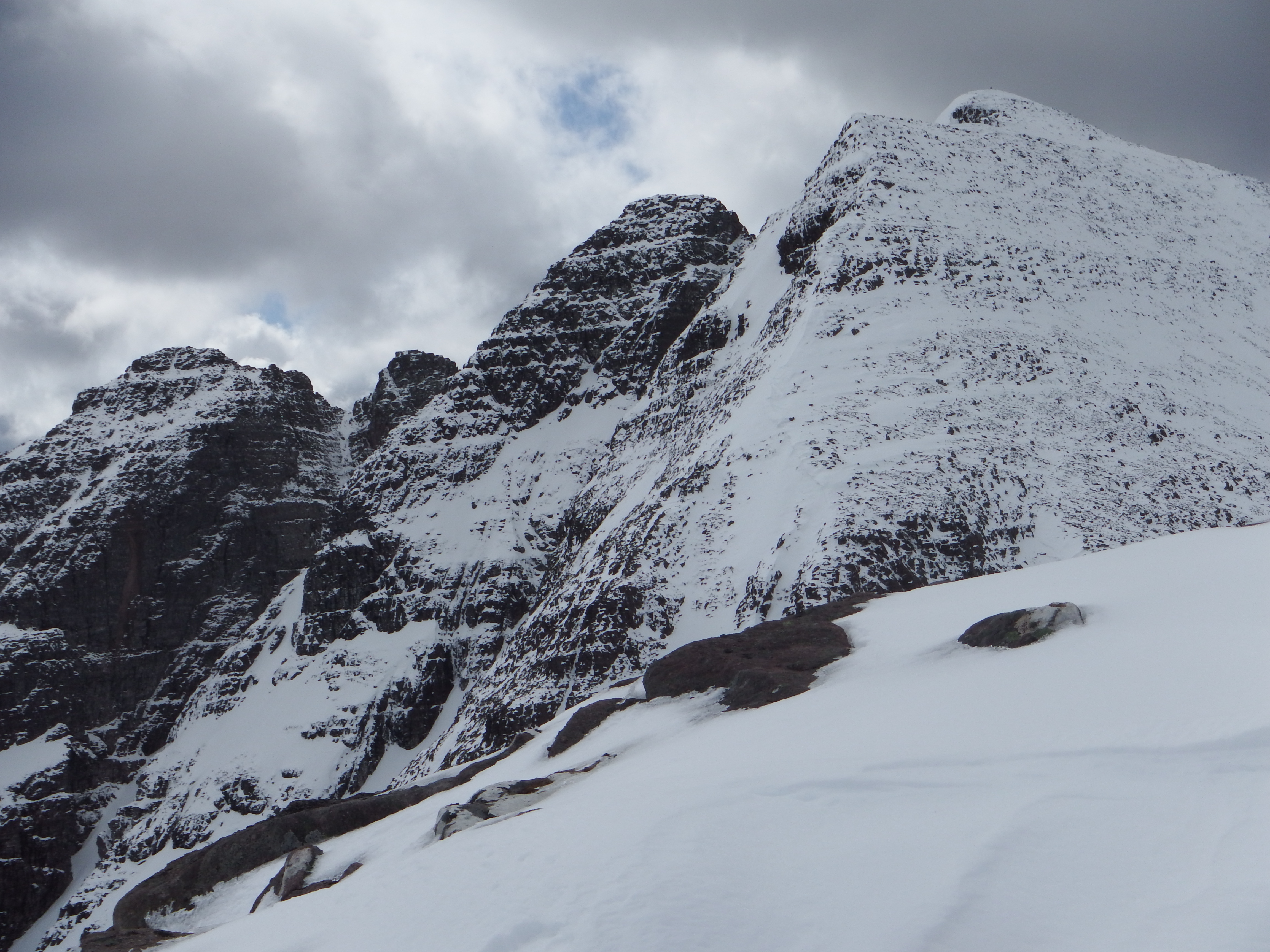 A rising traverse across the softish snow to the head of Glas Tholl finally revealed the breathtaking view SW along the striking pinnacles and gullies of this sandstone citadel.