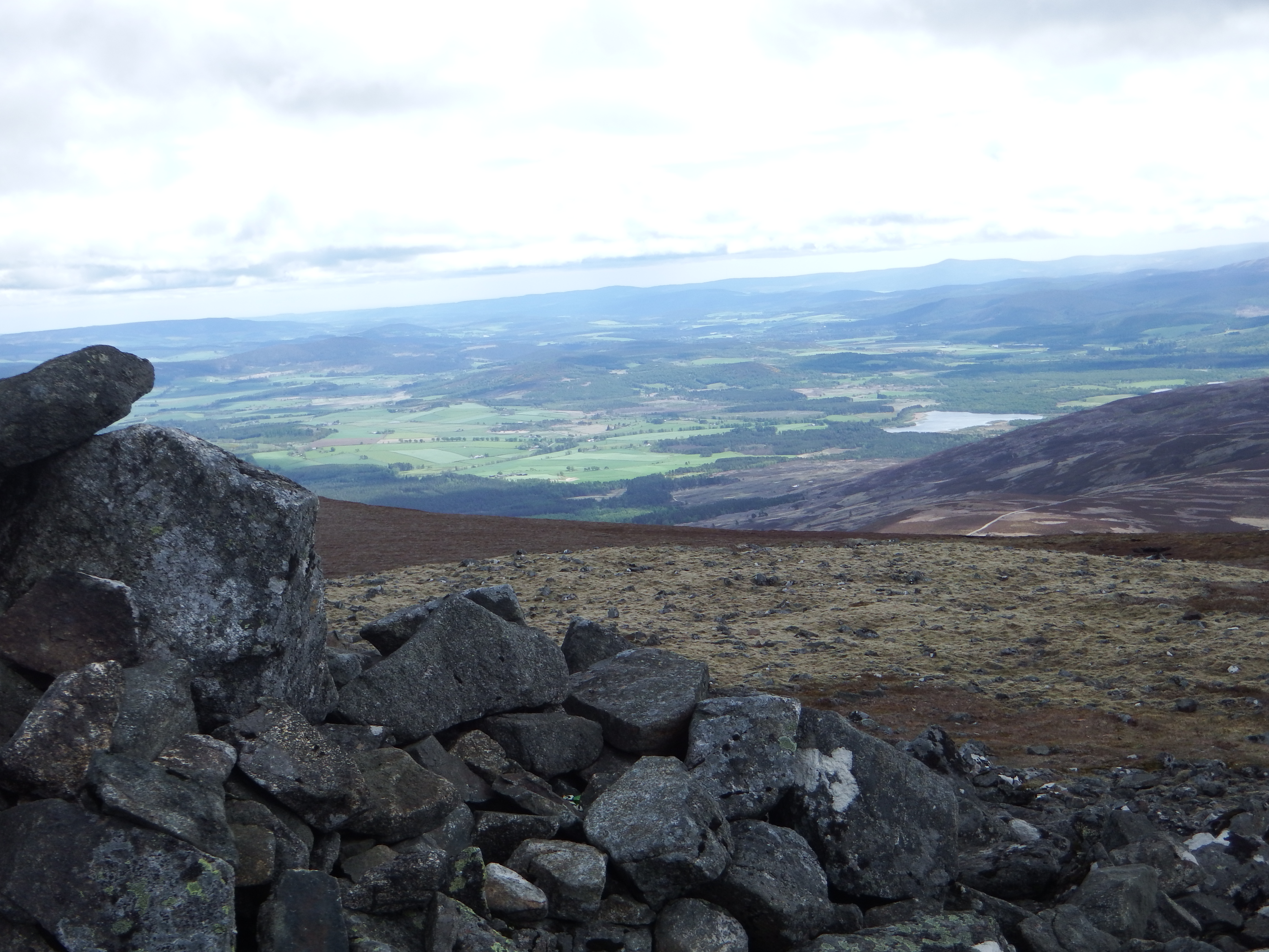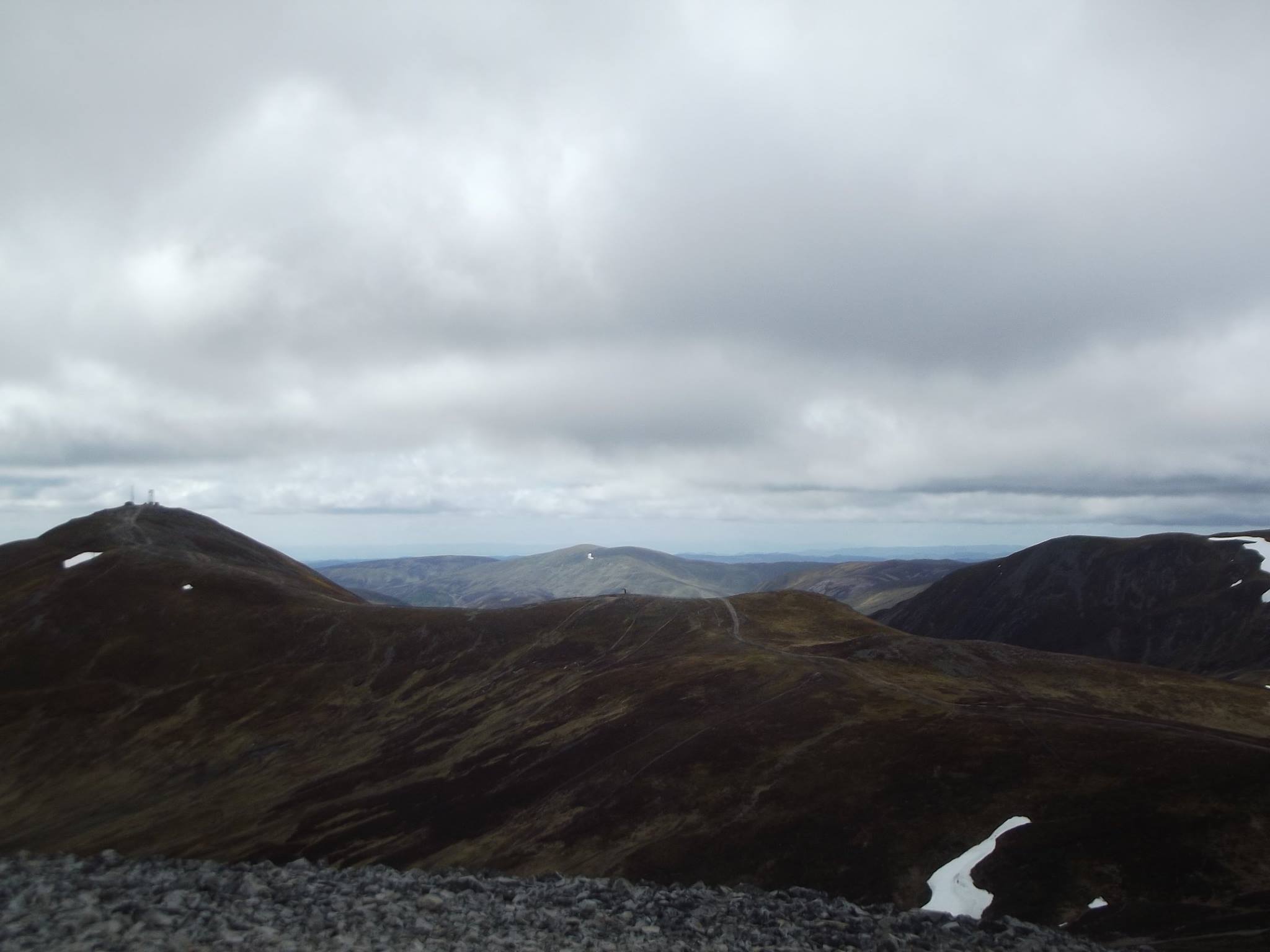 Also on Friday, Norrie met George and Susan at the Bunkhouse in the early afternoon and, in the light of the conditions they decided to stretch their legs on a nearby Corbett, Carn na Drochaide, North west of Braemar. This Corbett is fairly unremarkable but it does offer some excellent extensive views over to the Eastern Cairngorms and down over Braemar to Lochnagar. Fortunately the conditions remained good enough to appreciate the views, but looking over to Ben Avon and Beinn a’ Bhuird there was no envy of anyone battling the elements on those summits.