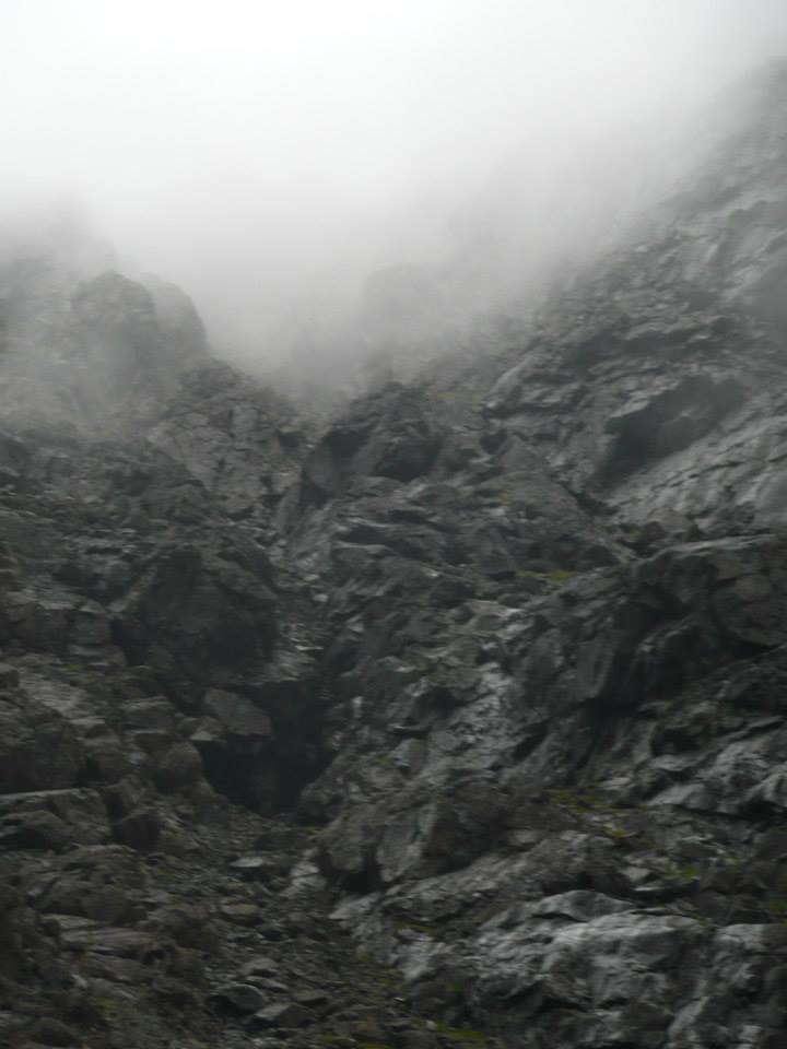 Sadly, the optimism on the weather proved to be unfounded and standing at the bottom the ridge with a fair wind blowing and a heavy mist shrouding the middle and upper sections of the climb it was decision time for the party. Young Blair was keen to give the climb a try but his father James wisely decreed that once again Fraser’s way would prevail for him and the boys – in this case by heading up the adjacent An Garbh-choire to gain access to the main Cuillin ridge. Rowena also decided that she would give the climb a miss and accepted James’ invitation to join them. Norrie, who had done the climb previously in better conditions also decide to opt out and the five scrambled carefully back down off the ridge into the choire.