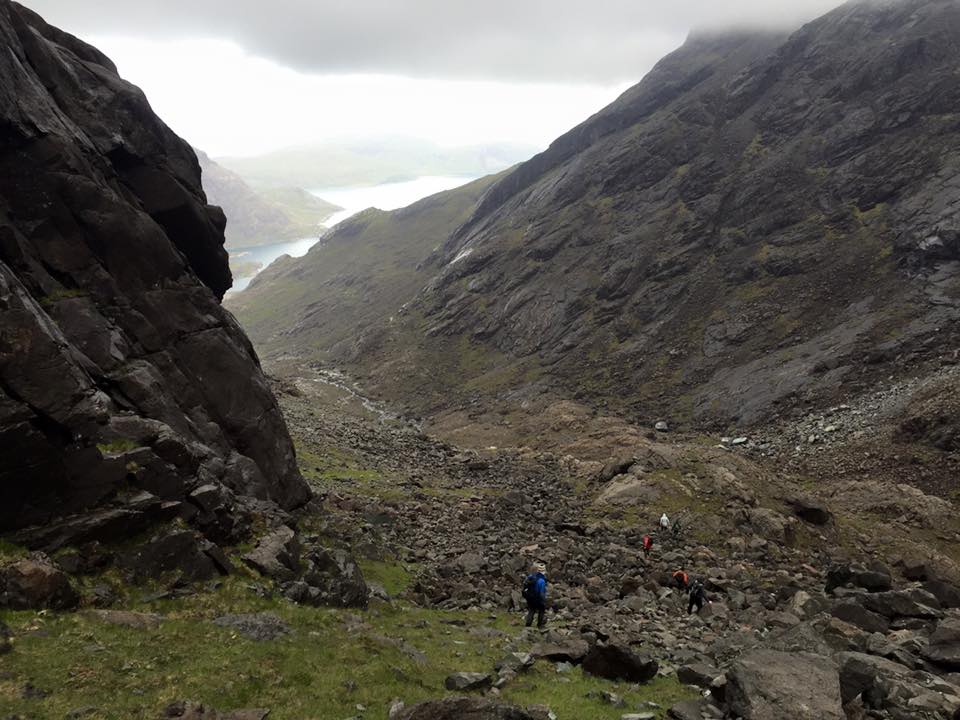 In the morning the crew slowly got their rucksacks packed and boots on before heading along the shore of Loch Coruisk. A short scramble then saw them attain the Dubh ridge just below the massive slabs of gabbro rising ominously into the distance.
