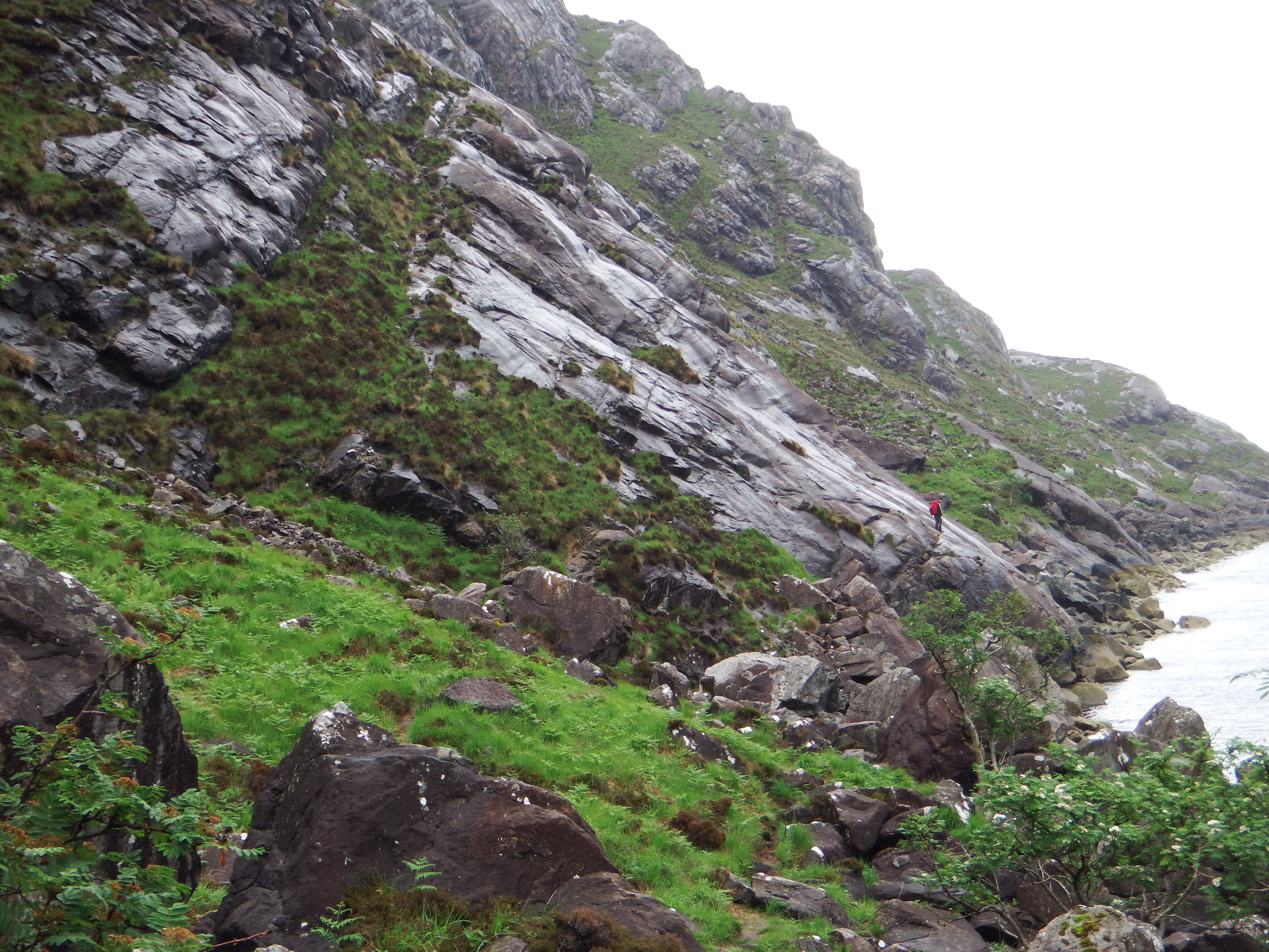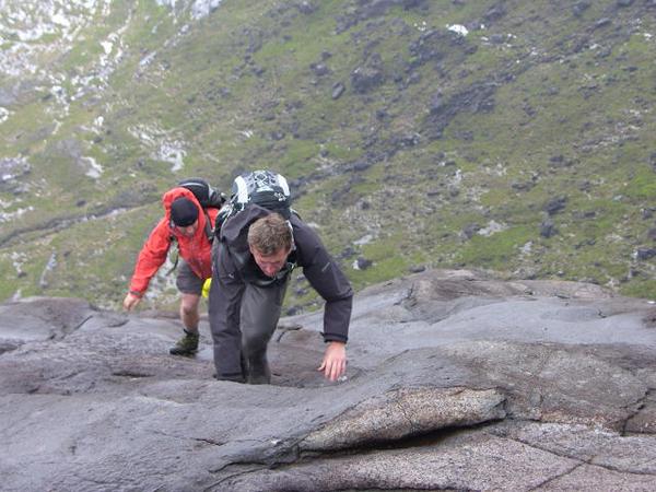 Once across, the relief was short lived as the infamous “Bad Step” lay a short way along the path. The step involves a negotiating a crack in a massive gabbro slab above the lapping sea – not too difficult without heavy packs – but a bit disconcerting when heavily laden. Paul headed over first, dumping his pack so he could return and aid Rowena by taking hers. George won the “Roadie of the Year” award by manfully carrying over Norrie’s soggy guitar.