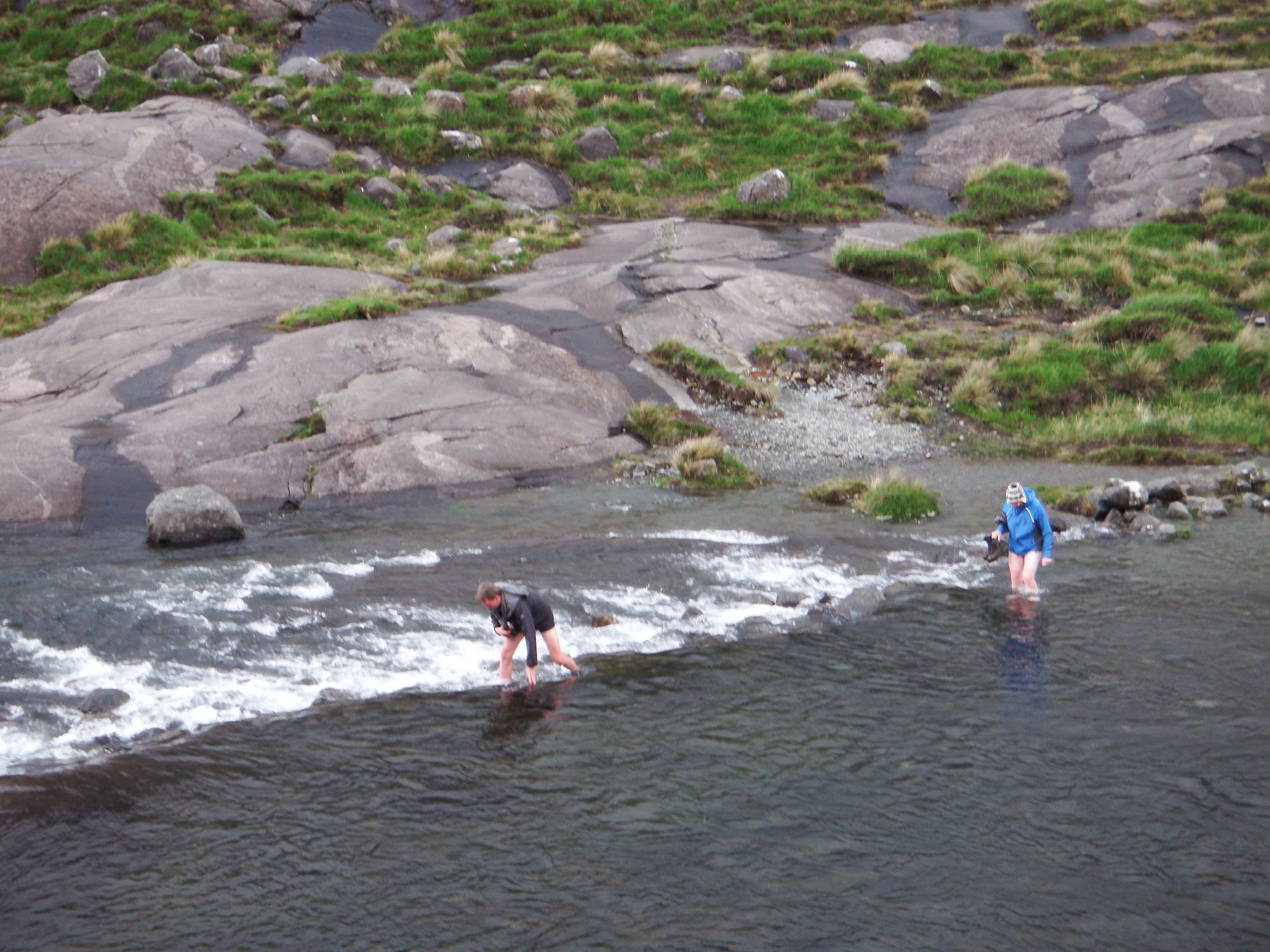 Contrasting techniques were adopted to cross the river – some elected to take off their boots so they would have dry feet for the remainder of the walk. Others chose a “what the hell” attitude and waded over, albeit the slippery river bed made this quite difficult as well.
