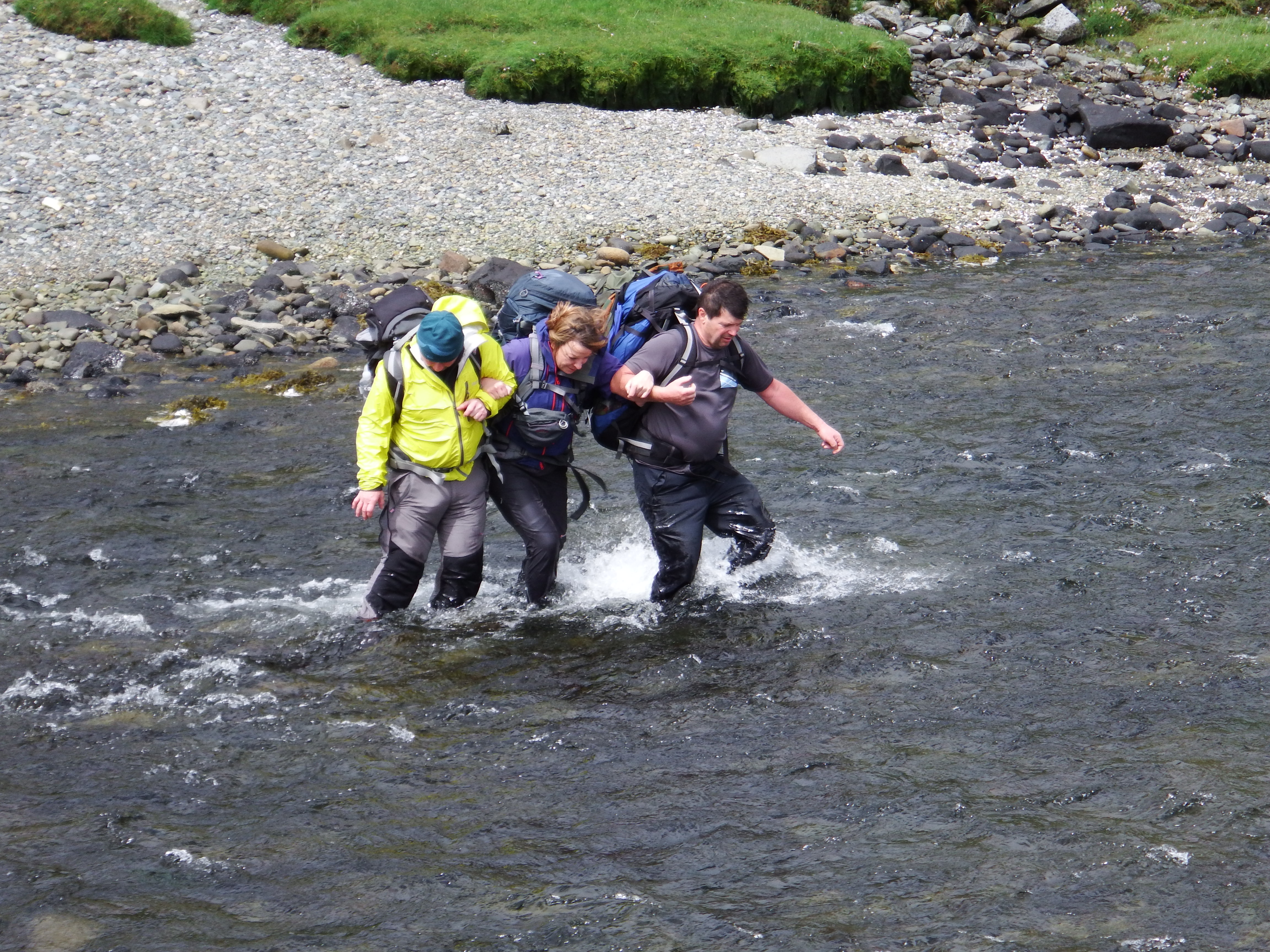 Further up at the stepping stones the remaining members once again set out across the river which was probably even deeper than it had been on Friday. There were a few inevitable stumbles as the heavy packs did little to improve balance. Rowena was one who decided it was bath-time before finally emerging from the water in a scene reminiscent of Dr No.