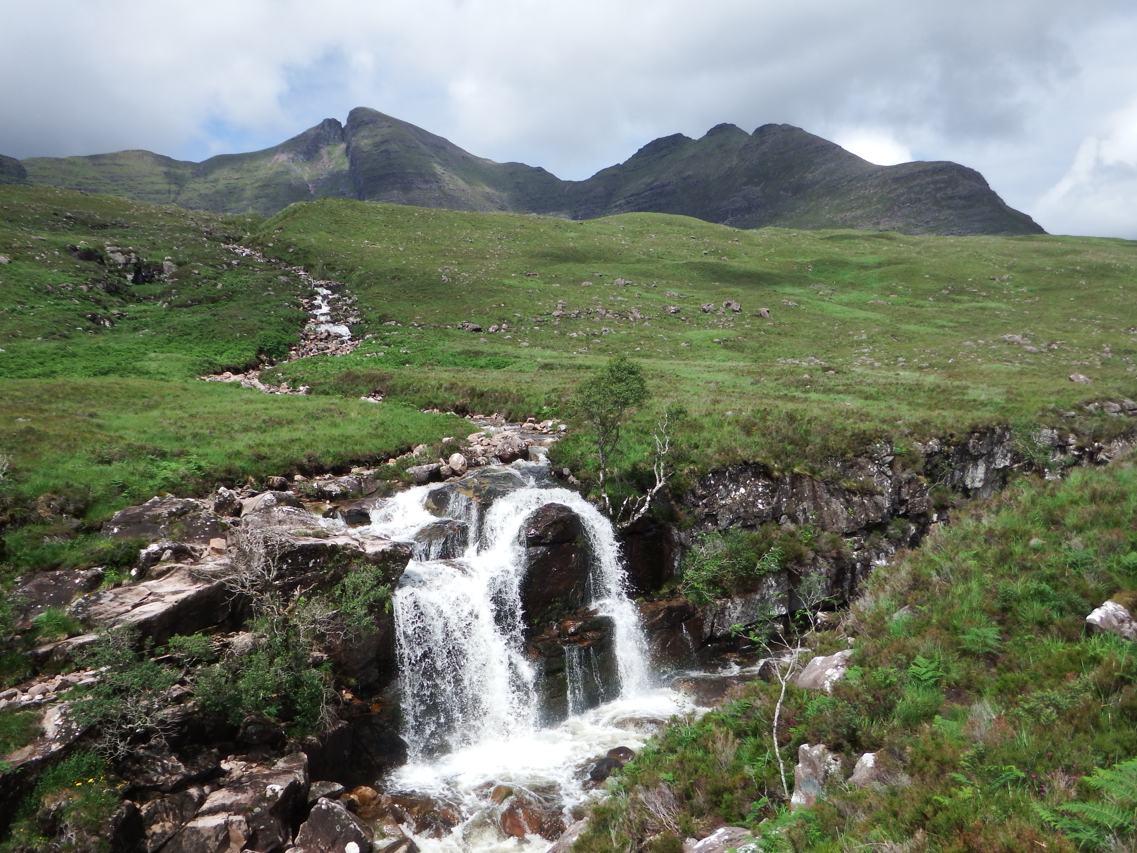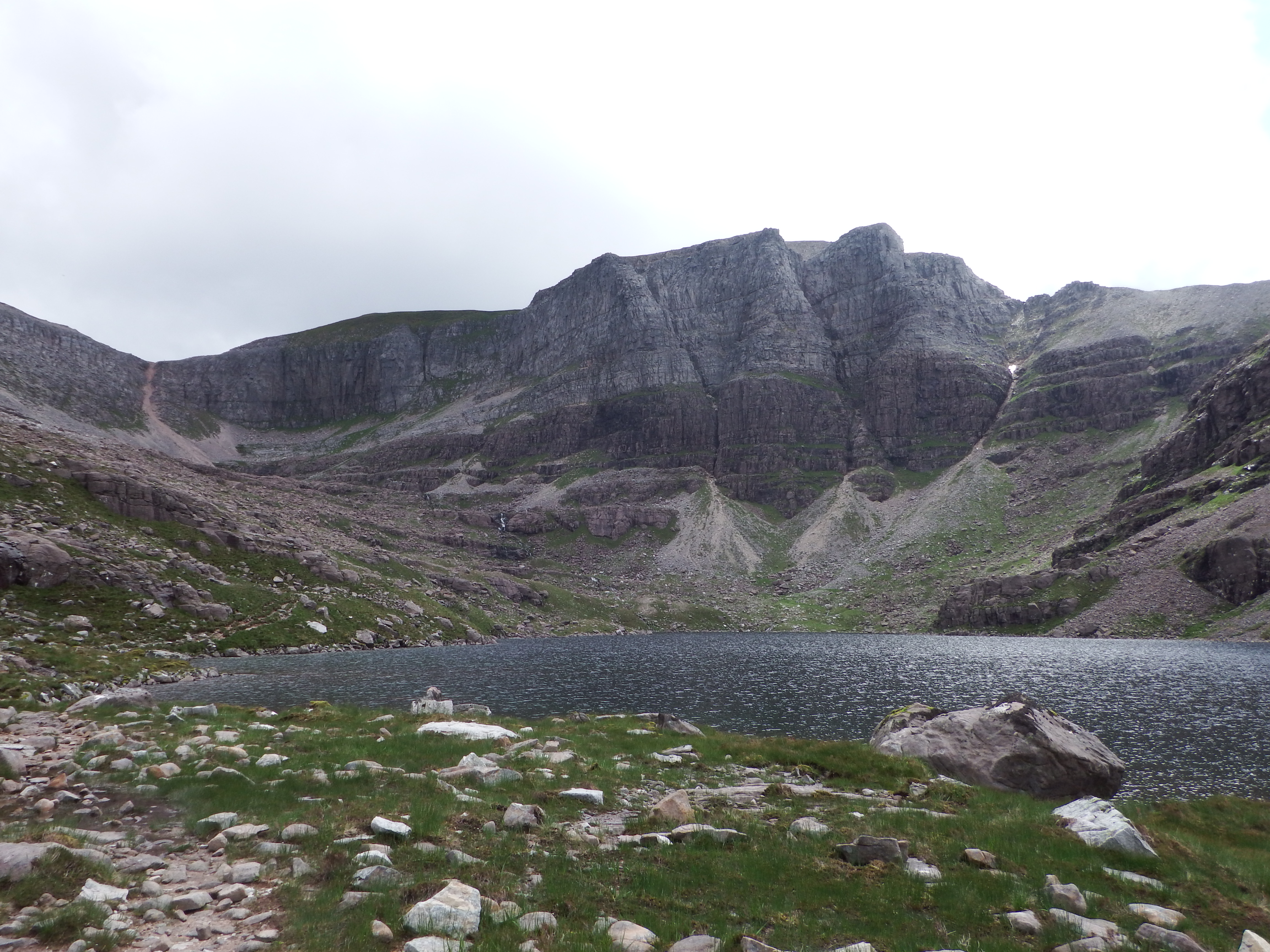 Saturday had a similar forecast to Friday and again a late start was planned with the target being Beinn Eighe’s two Munros via Coire Mhic Fhearchair. The walk into the Coire from the car park was quite long but straightforward with a gentle rise, then past some lovely waterfalls up to the Loch at 550 metres. Coire Mhic Fhearchair is probably the most jaw-dropping Coire in the Scottish Highlands with the imposing triple buttress and sheers cliffs dropping down to the Loch.