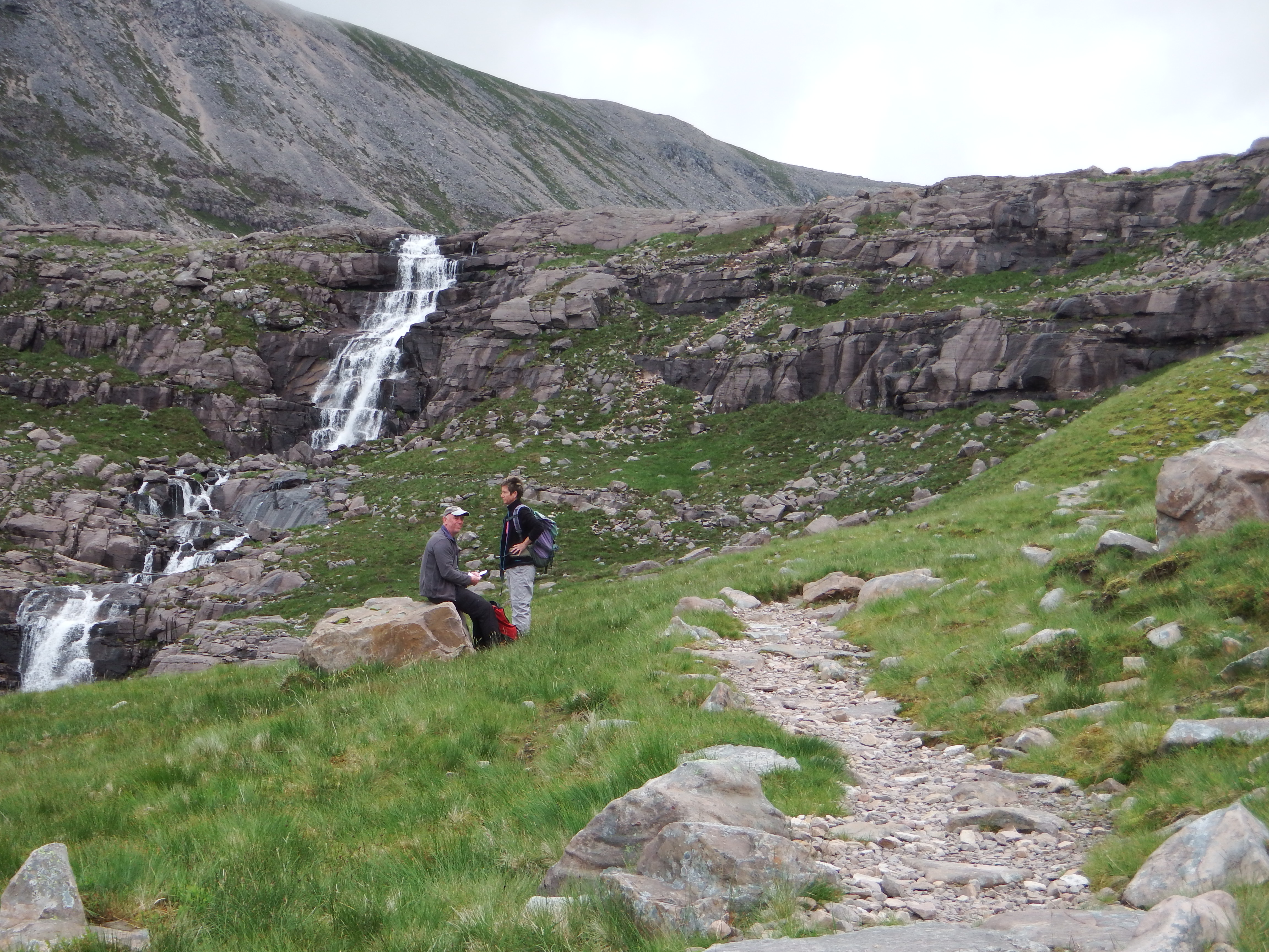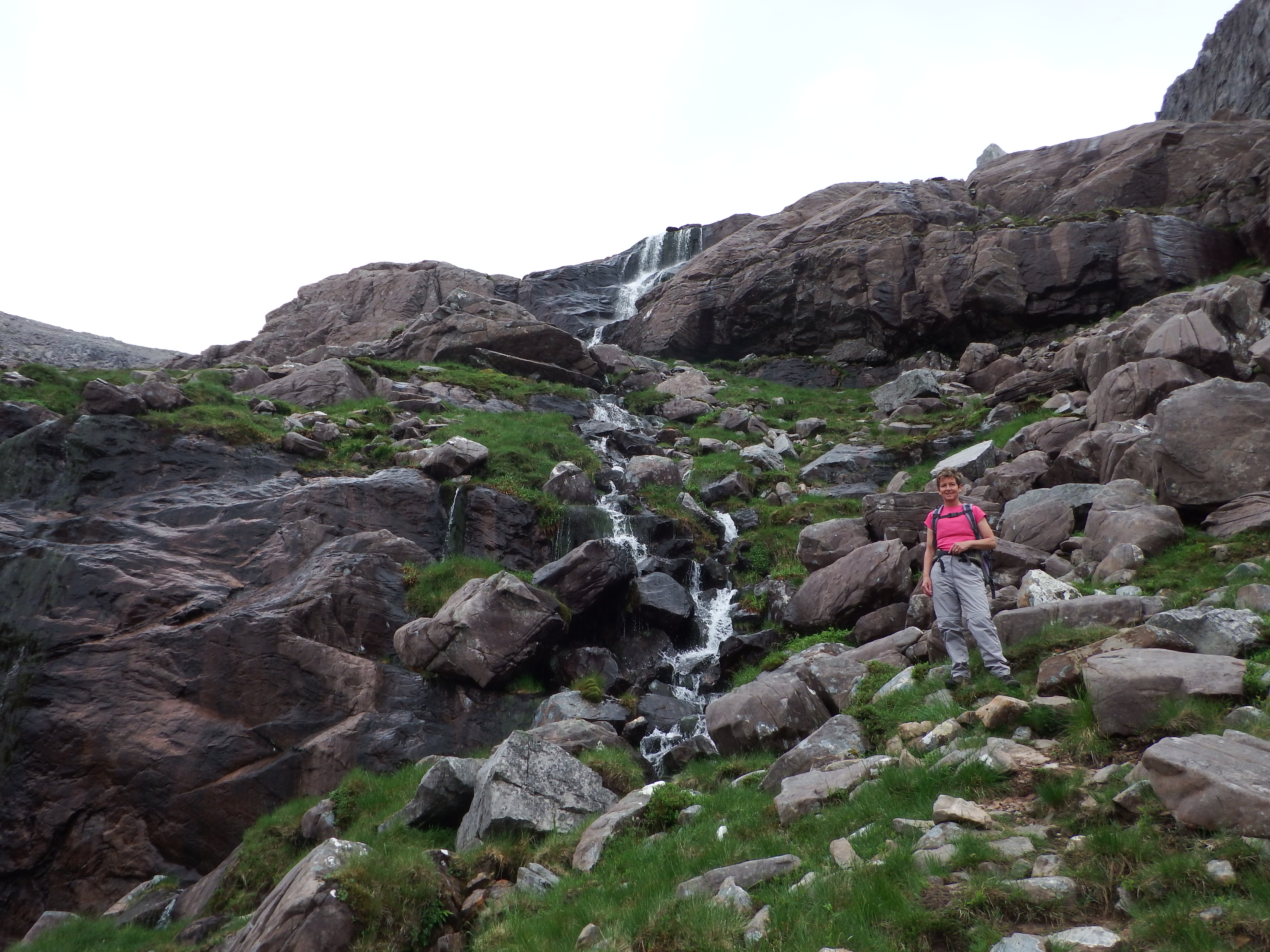 A walk around the east side of the loch leads up past some more pools and waterfalls to a curtain of scree stretching up to the col which takes the walker onto Ruadh-stac Mor. The scramble up the scree slope was tortuous and the needle on Norrie’s pechometer nudged eleven before he finally emerged onto the ridge where George and Susan were waiting. A short stroll then took them up to the summit where the breath-taking 360 degree views were soaked in.