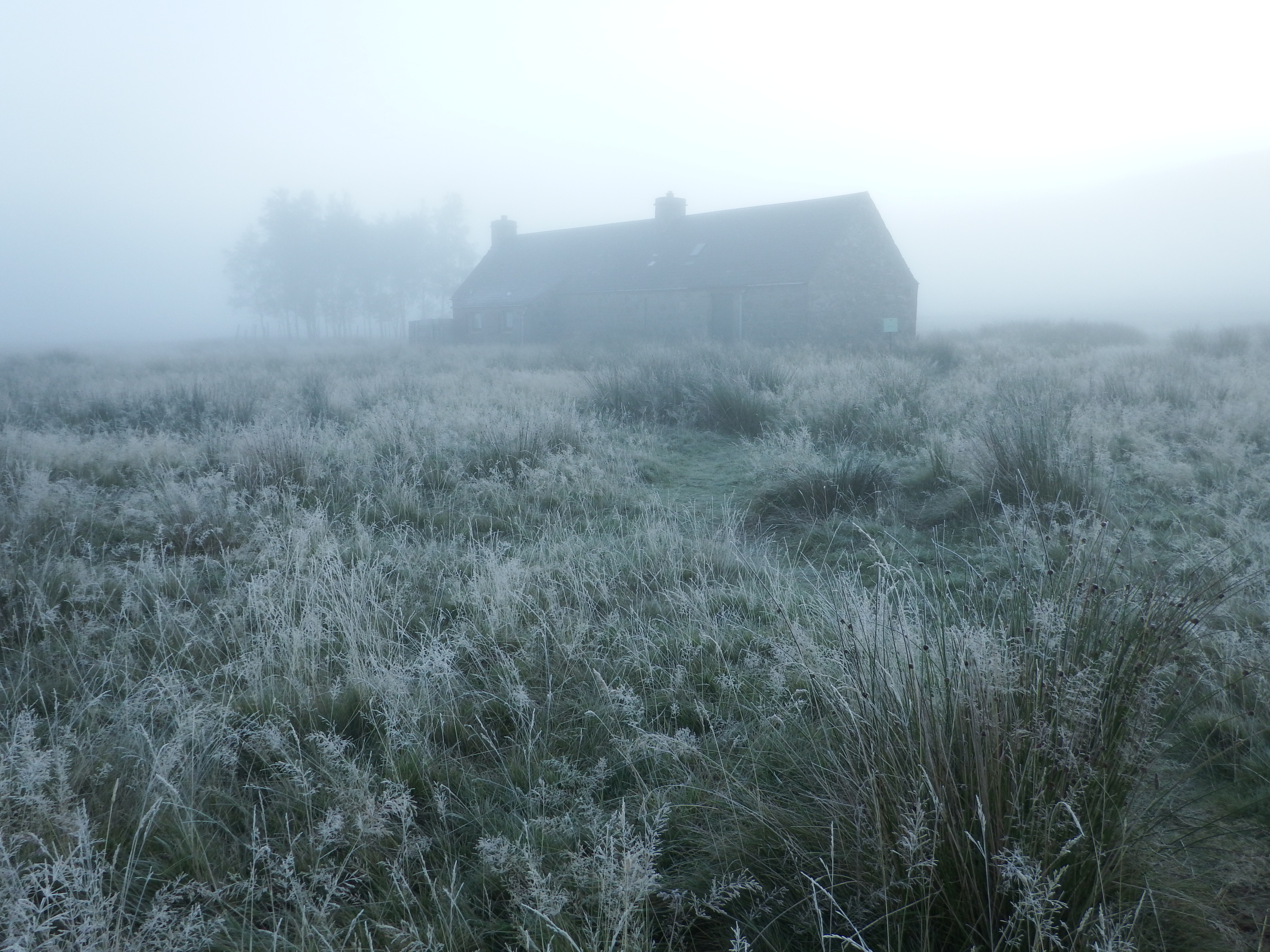 Rumours of deteriorating weather proved to be grossly unfounded as Saturday broke – it was cold, frosty and a thick mist enveloped the hut and the vegetation but there were clear signs that the sun would soon burn it all off. Bags packed, the group soon began the misty march to the layby where the cars were parked and they enthusiastically headed off to their destinations.
