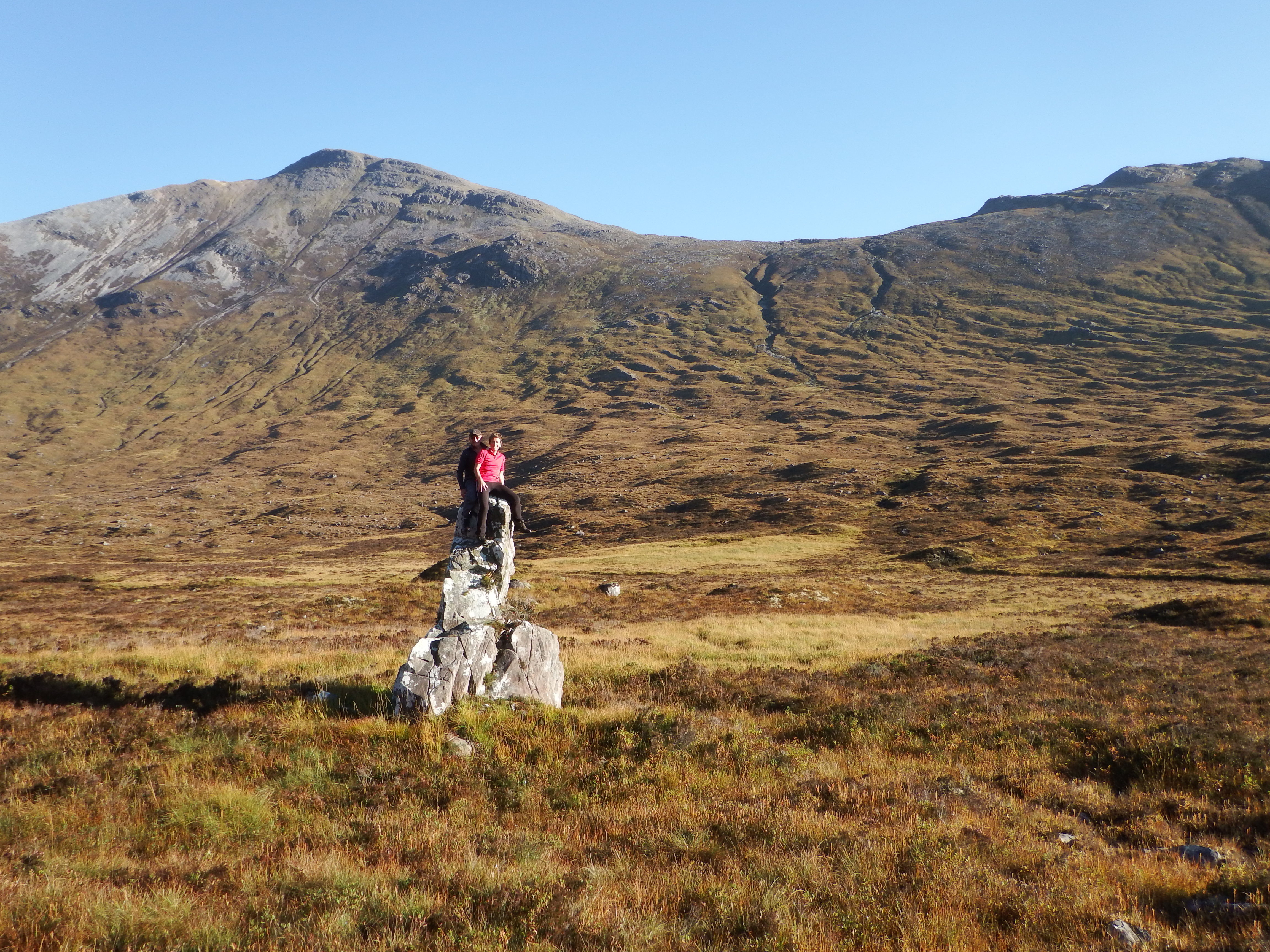 George, Susan and Norrie had set off from Coulags shortly after 9 o’ clock and headed up the glen alongside the Fionn Abhain and past the Coire Fionnaraich MBA bothy, which despite notices to the contrary appeared to be open even though the stalking season had not quite finished. The great stone of Clach nan Con-fionn (where the giant, Fionn tethered his hunting dogs) was a photo opportunity not to be missed as Wild Norrie Hickock and Calamity Susan clambered aboard the trusty rocky steed.
