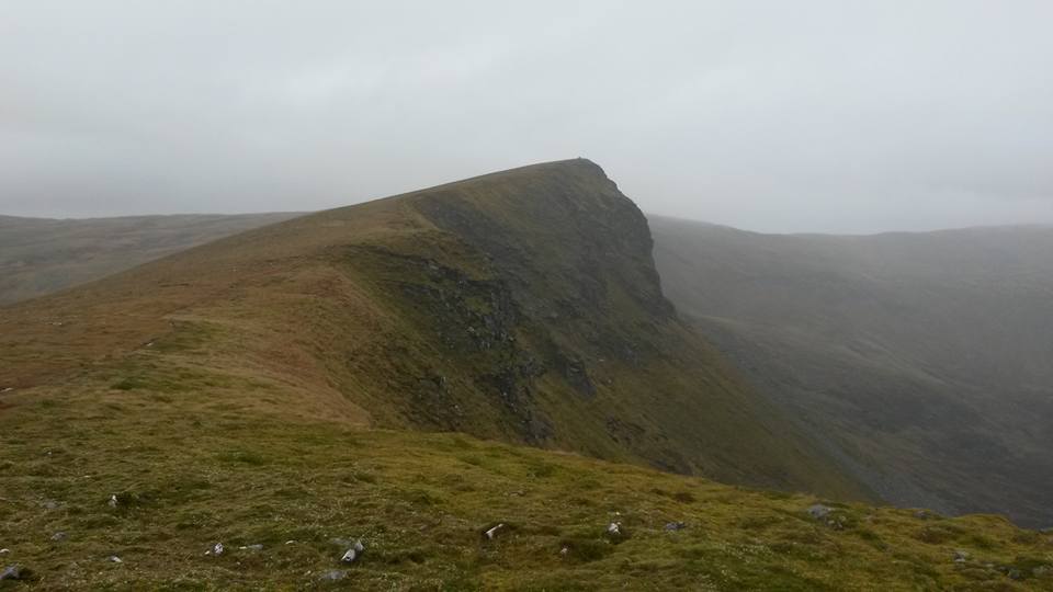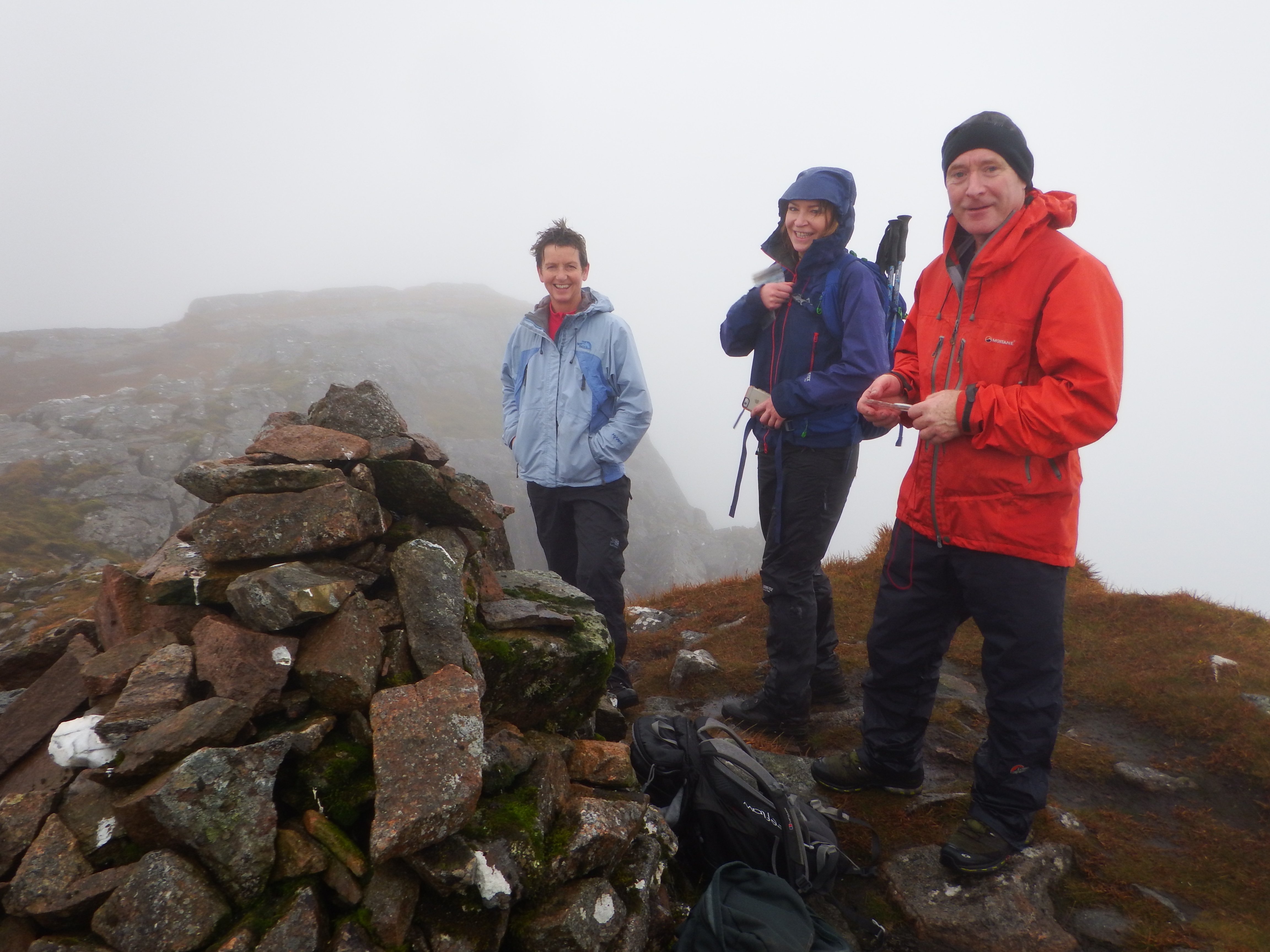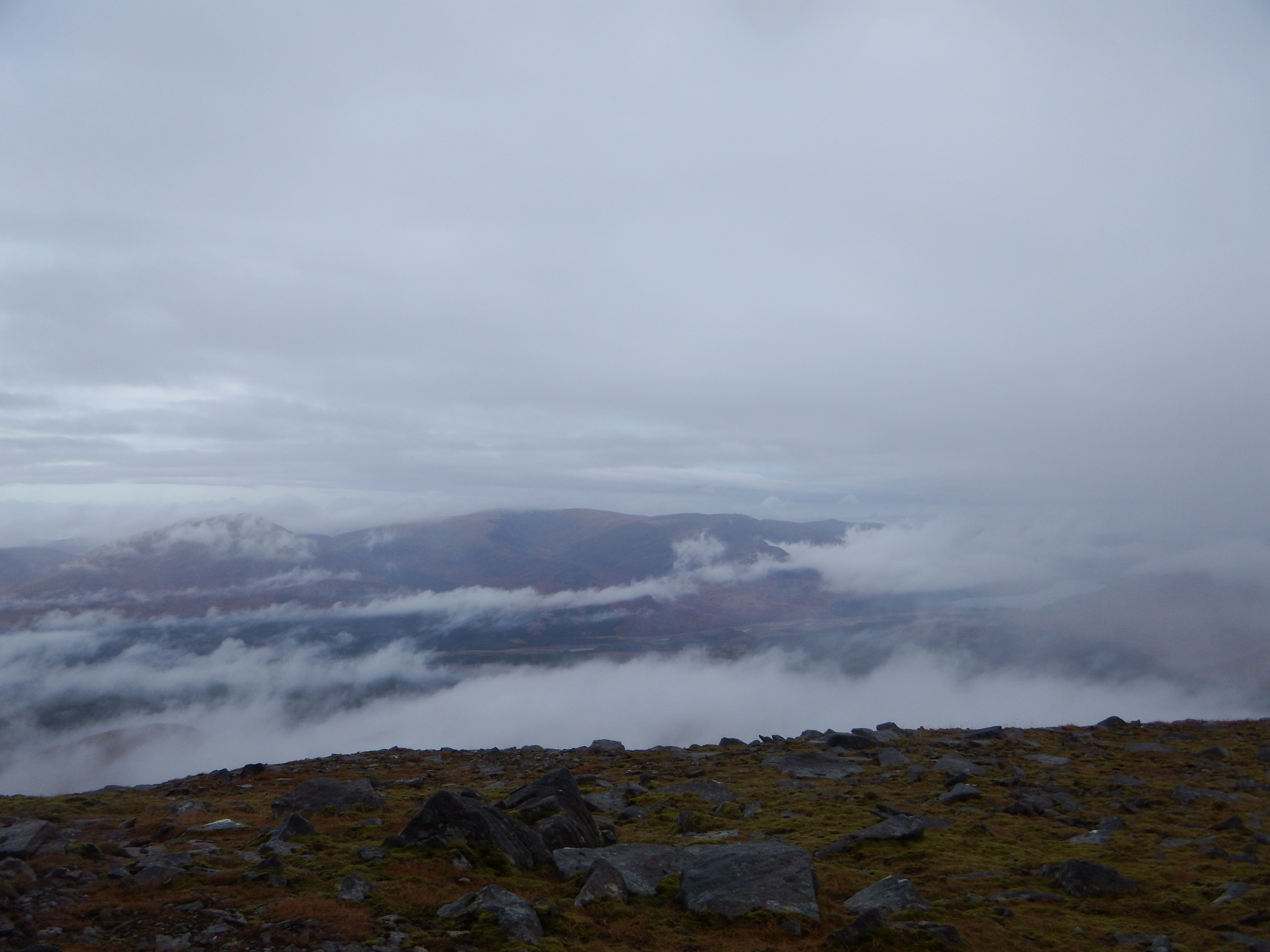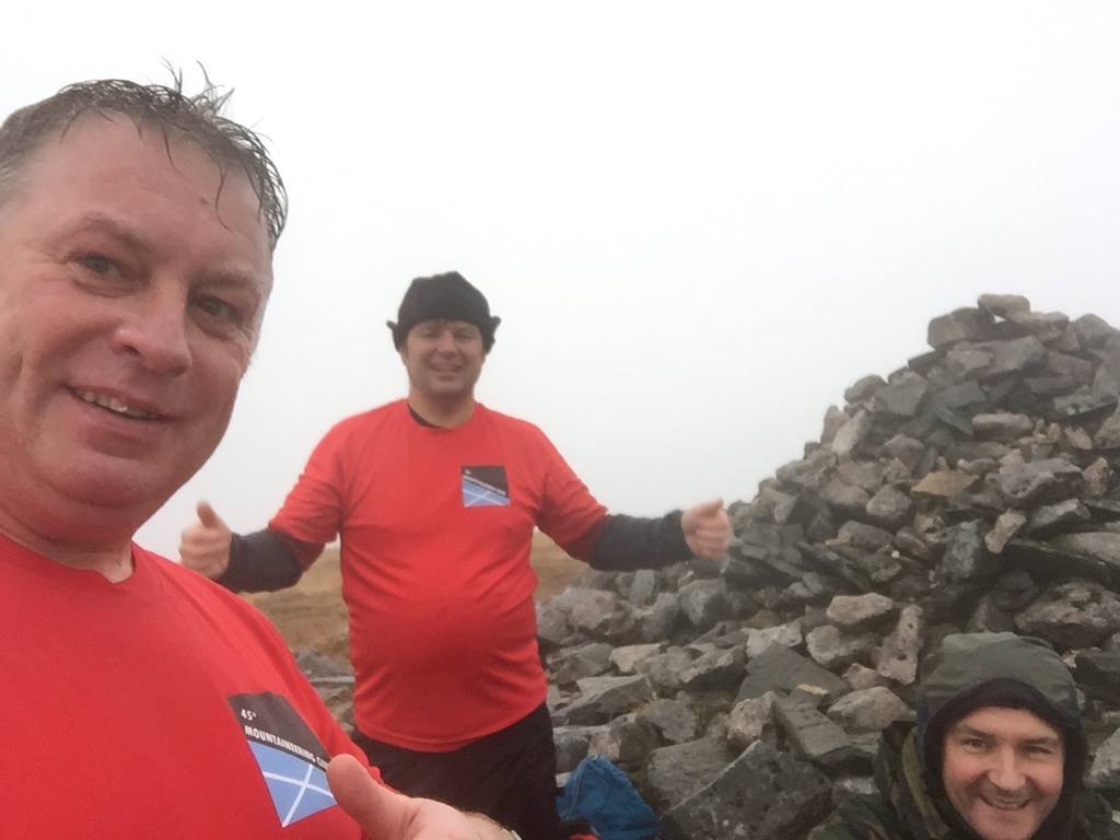 A fairly inglorious plod up the boggy hillside saw them attain the ridge of Sron na Garbh-bheinne and thence on to the summit which is apparently an excellent viewpoint. This wasn’t evident today though and sustenance had to be taken in the clag. Off they then headed over point 958m marked by a superb quartzite cairn before heading east up the easy angled sloped of the higher, but less dramatic Chno Dearg. Miraculously, as they reached the summit the clouds broke and there were rewarding views over to Creag Meagaidh in one direction and Glen Coe in the other.