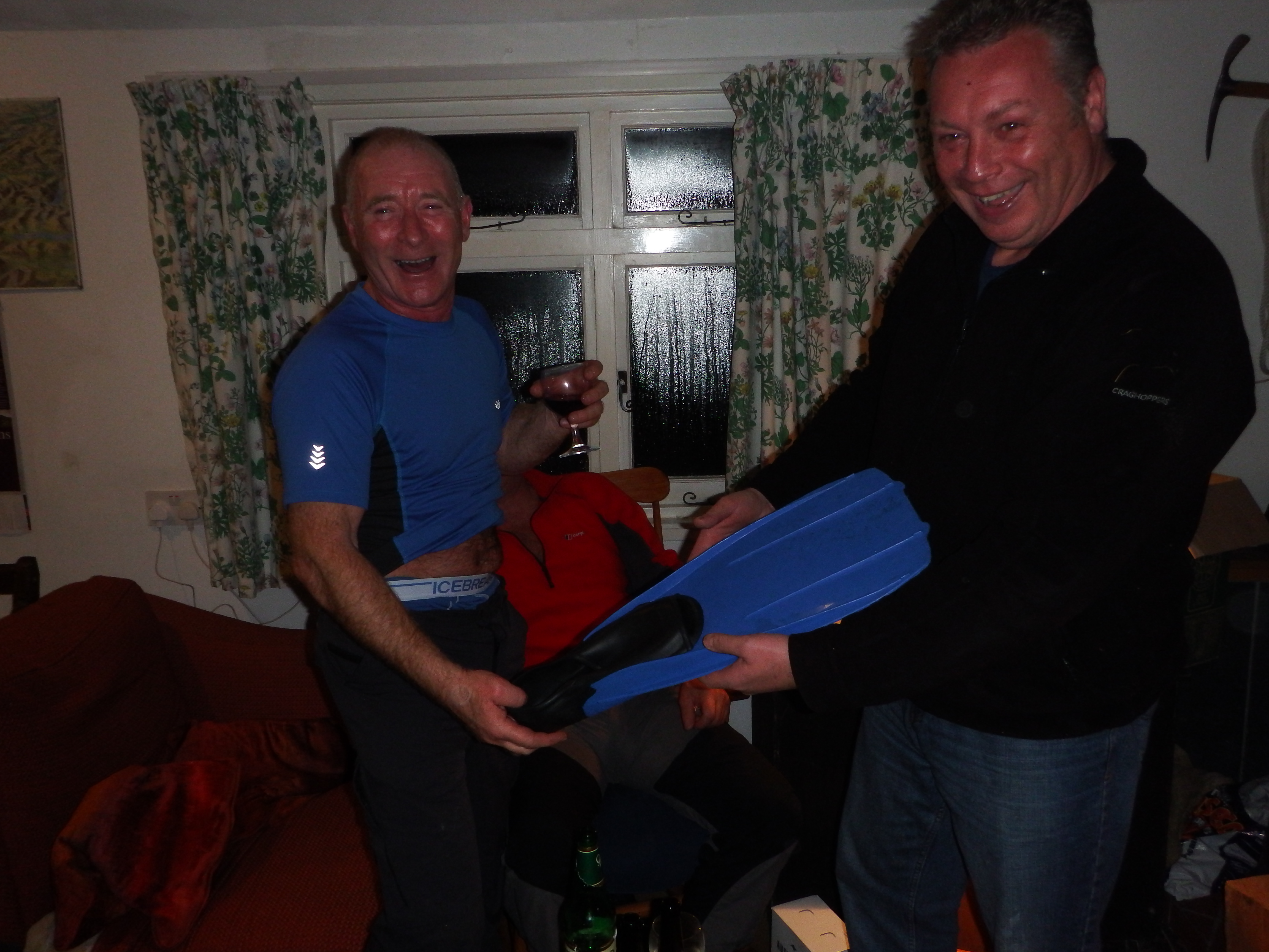 The Fraser party arrived a short time later and the evening undertook a familiar direction with wine, song and mickey-taking us well beyond midnight. Presentations were made with appropriate ceremony to Jim (blue flipper) and Norrie (wooden compass).