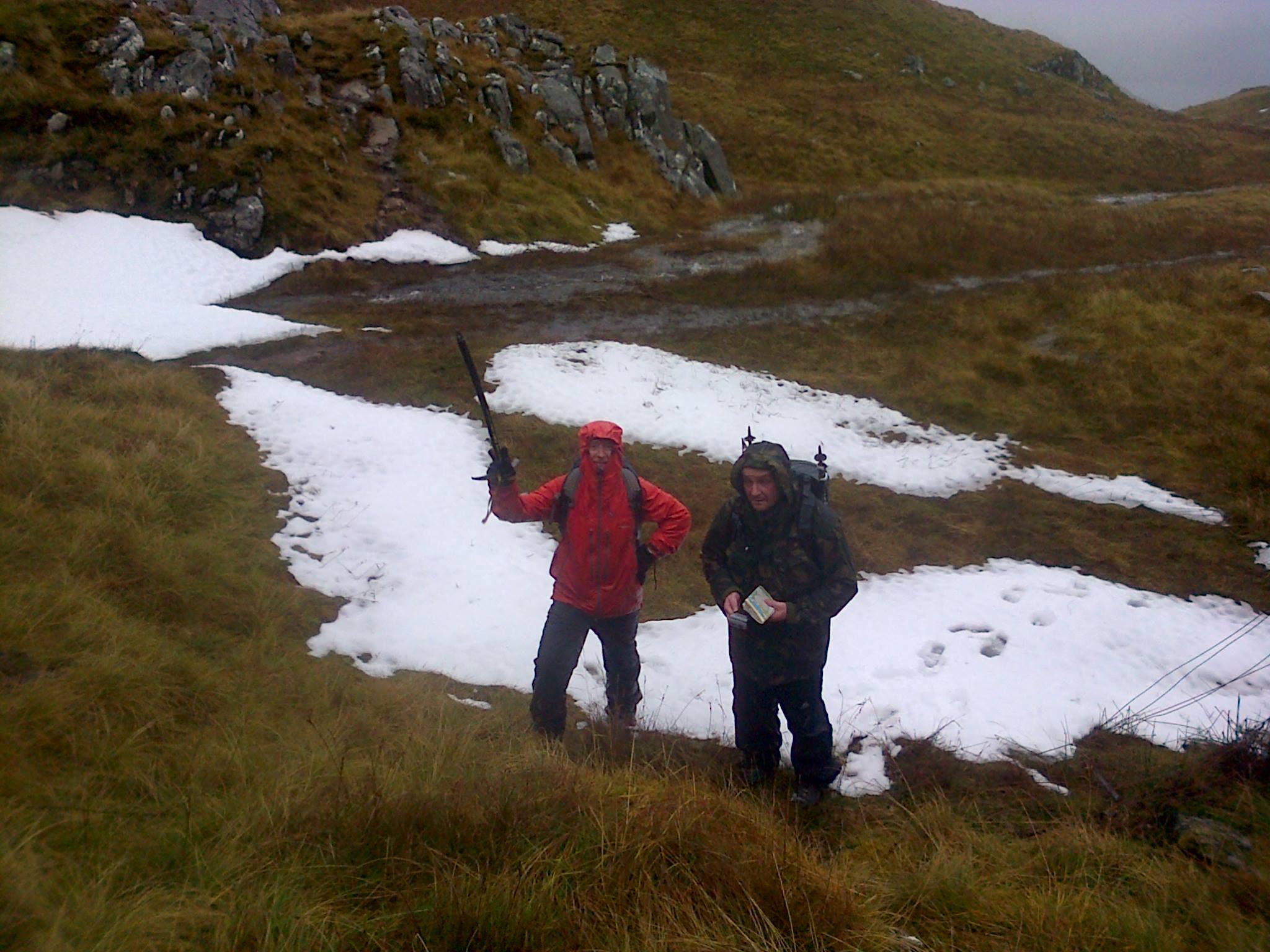 Neil Morrison and Alan Orr opted for the Corbett Fraochaidh via the bothy Tigh Seumas a’ Ghlinne, House of James of the glen. The Red Fox, who was hung for a murder he didn’t commit and was the basis for the novel ” Kidnapped ” However it wasn’t a history lesson they were to get. On approaching the bothy they could hear music mixed with the hum of a generator and when they opened the door and entered, focusing through the smoky haze of herbal grass, were greeted by a bunch of new age hippies complete with beards and dreadlocks, music blaring through amps and totally spaced out, They did however offer a cup of tea,which was declined. Not so amicable was their Doberman that attacked and sank its teeth into Alan’s arm. A hasty departure from the bothy and our pair continued on path and forest track then path and other forest tracks and being unable to see a clear path up the Corbett beat a retreat back to the Alex Mac passing the New Age Warriors van complete with keys in the ignition but being forgiving souls did not fling them into the heather.