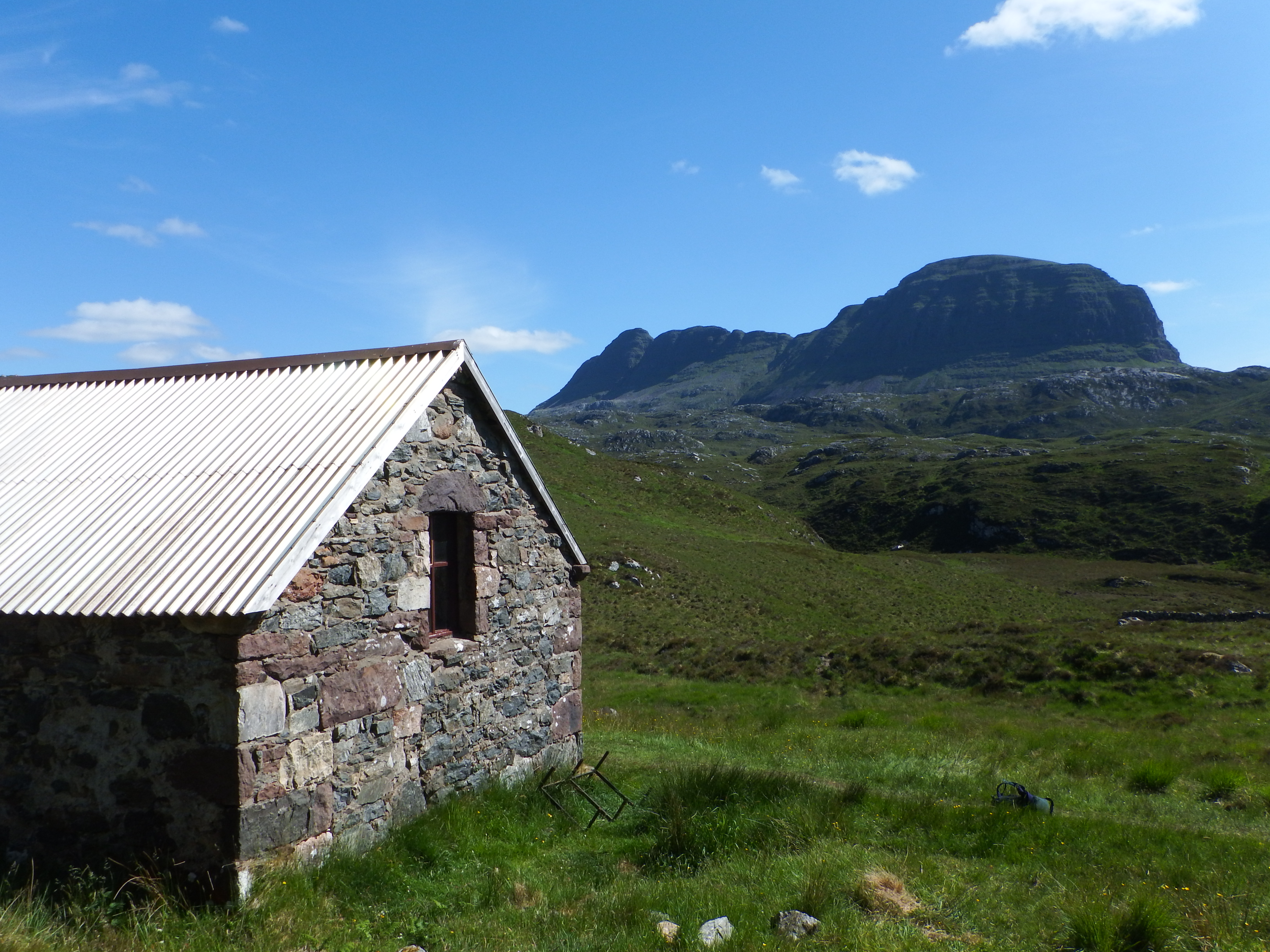 The Naismith Hut at Elphin, around 15 miles north of Ullapool was the venue for the Club’s June meet. The Hut sits just off the main road and has stupendous views west towards Suilven. It has recently undergone a makeover and with mains electricity and running water it provides a degree of comfort not found in several other huts. The capacity is fairly small though – and with two spaces reserved for SMC members we were able to accommodate only eight members. As it happened quite a few members were unable to attend for various reasons so everyone was happy.