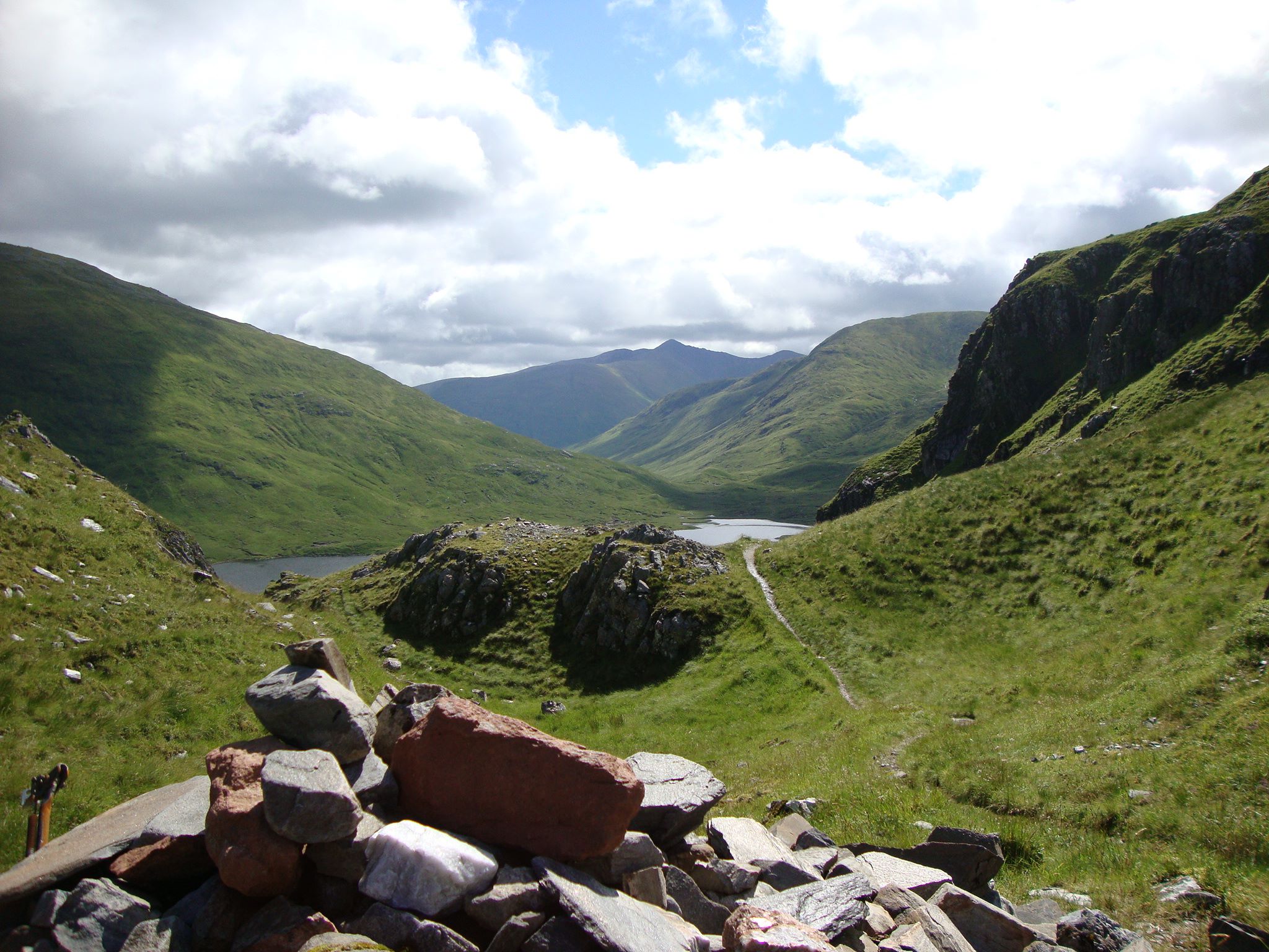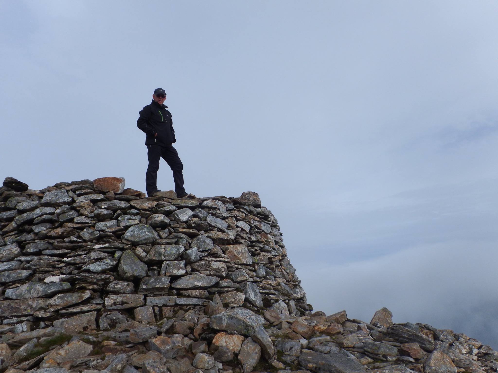 A boggy traipse up to ridge followed with a turn back east past a cairned top and well-constructed shelter to the top of Mam Sodhail with its magnificent summit cairn.