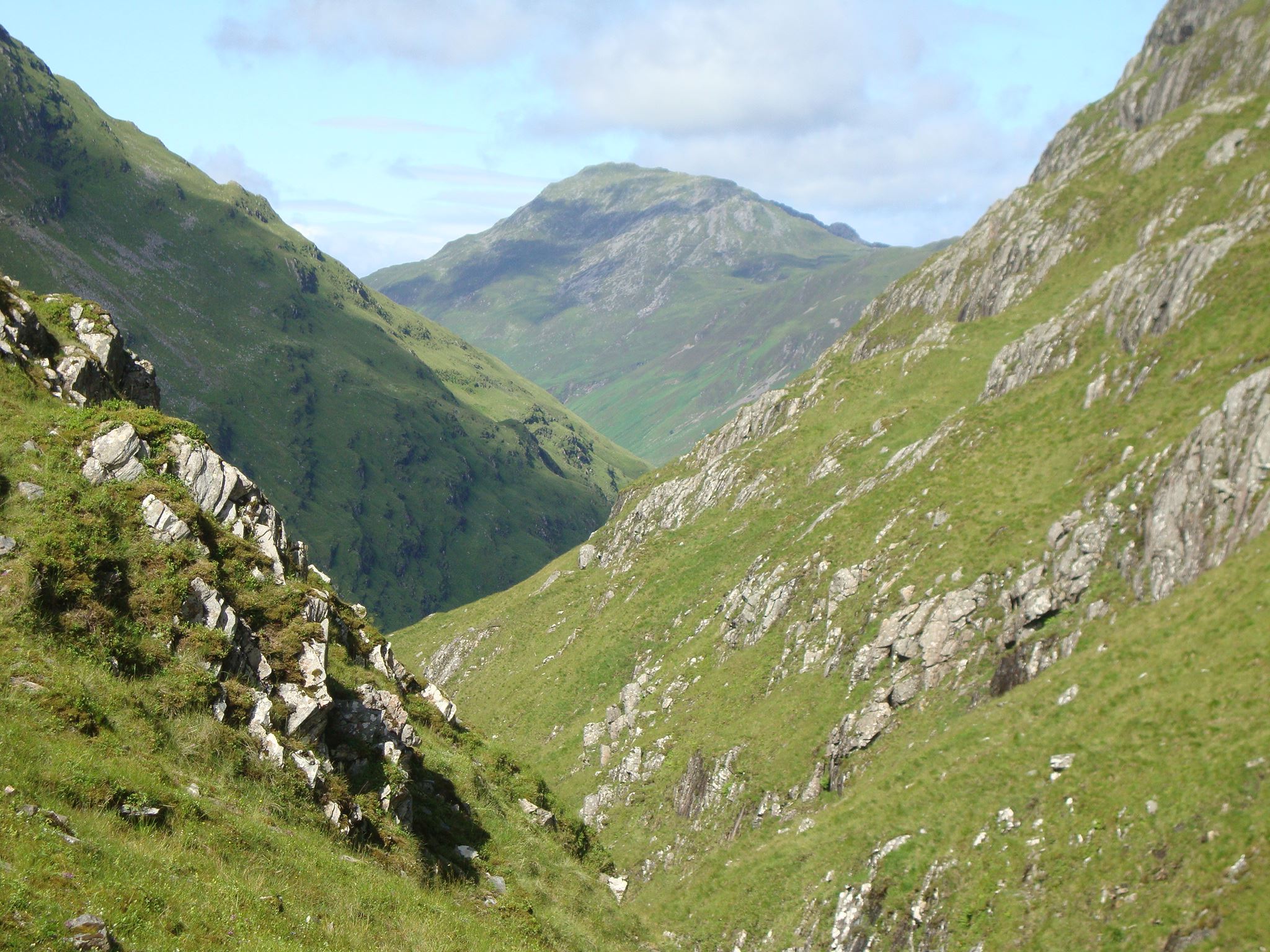 In true Robert the Bruce spirit he set off again the following morning with the far-off scent of baking scones encouraging his every step. This time he finally reached the sanctuary of Alltbeithe where, fortunately, Hannah, the warden had manged to save a few of her enticing scones to sate his appetite. An enjoyable evening was spent conversing with his fellow travellers and on Friday morning it was time to head for the hills. Heading straight up north from the hostel to the ridge ahead and a slight detour east saw him attain the munro summit of An Socath. The much more impressive Sgurr nan Ceathreamhnan lay a few kilometres to the west and soon he was headed for this classic munro summit – and beyond it to the West Top before dropping back down to the hostel, retrieving the rest of his stuff then shuffling off east the 5k to Strawberry Cottage to meet the others.