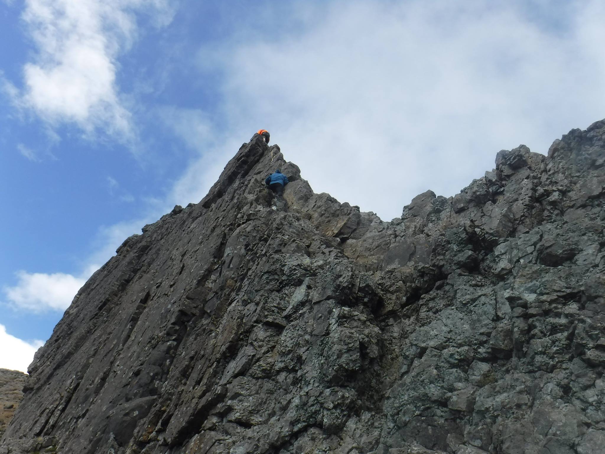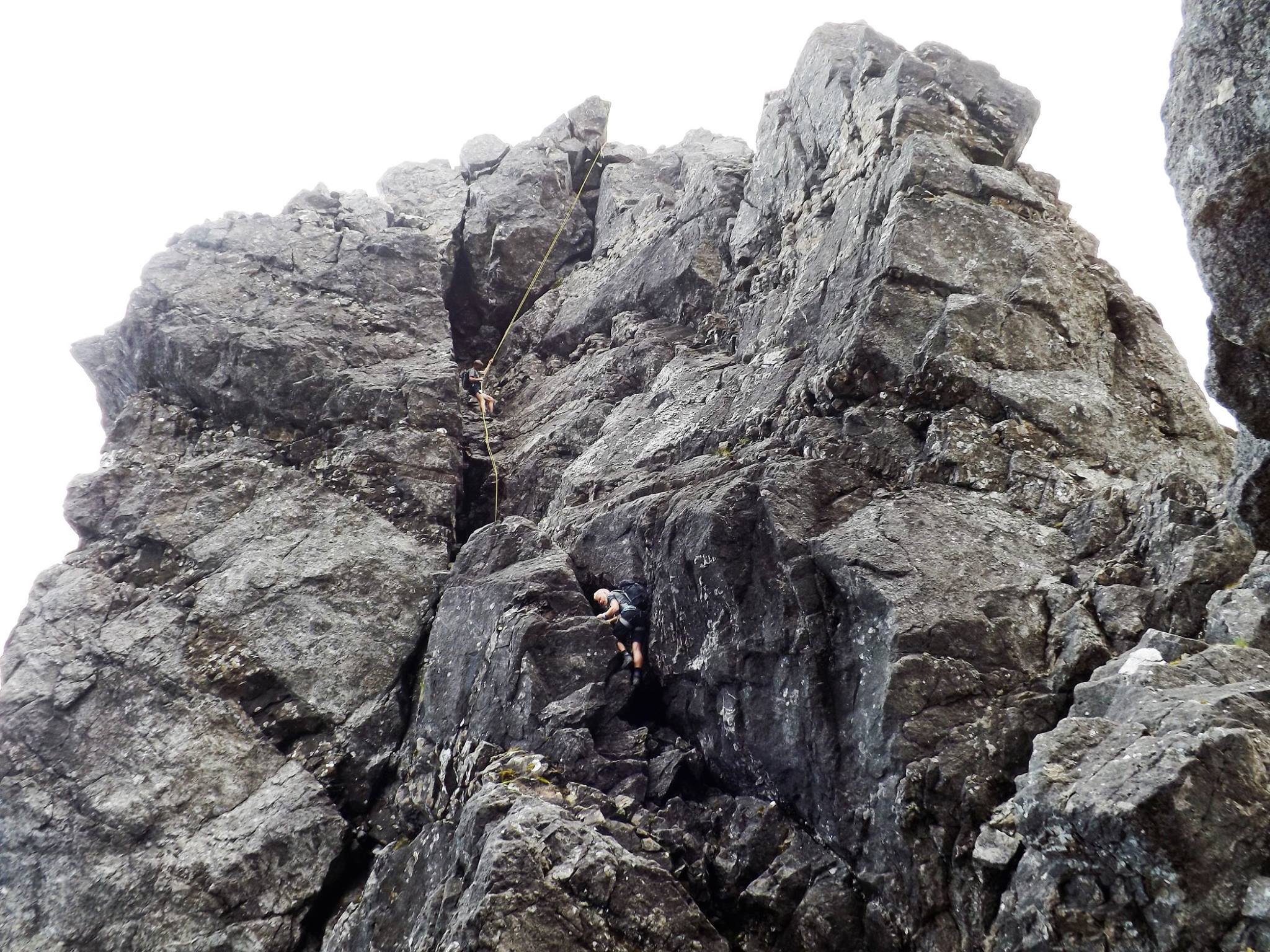 With the adrenalin still coursing through their veins, they pushed on to the base of Sgurr Mhic Choinnich where the easy, but highly exposed Collie’s Ledge leads around below the peak before the ridge is attained. A short scramble back south led them to their final summit of the day.