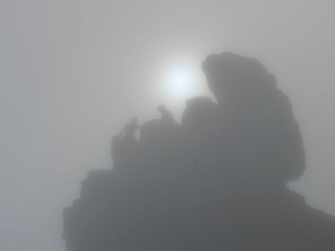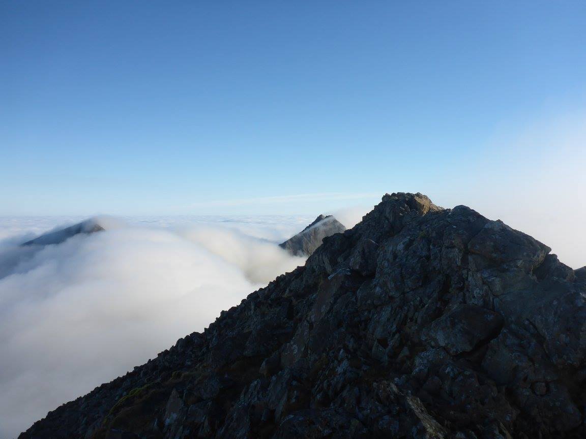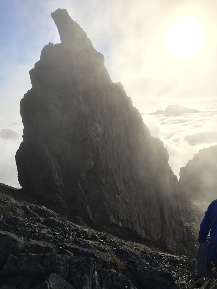 Sometime before sunrise Bill, Rowena and Iain decided that it would be a perfect time to make their ascent of the Inn Pin. If they left at that time, there was absolute certainty that they would have it to themselves. The three duly packed their gear and headed up the ridge – and they were well rewarded with some amazing early morning sunrise panoramas. Bill led the climb up the Pinnacle followed by Iain and Rowena and an abseil back down the west ridge completed the task and they headed back to the hut chuffed that they had managed to get the Inn Pin done so early.