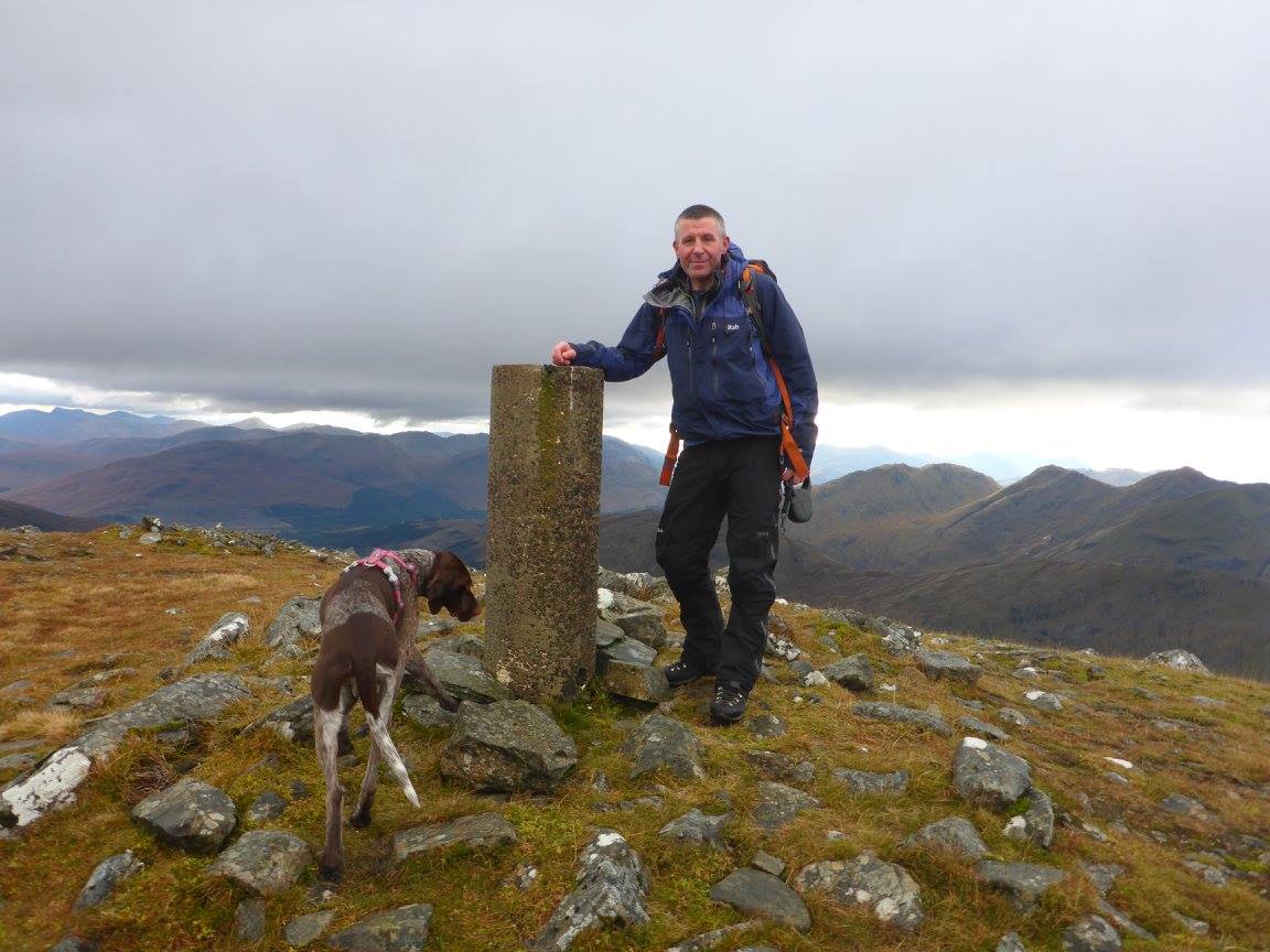 The others continued up, following the path by the burn until (after a break for a natter with a couple of other guys) they reached the summit ridge and a short walk to the cairn. The plane was to head west and walk for 5k or so back to base – although there were to be different interpretations of “base”. The moody atmosphere, the gorgeous autumn colours and the spectacular outline of mountains in all directions made the walk back a very pleasant one.