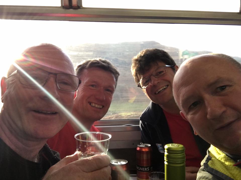Alan, James, Jim, Raymond enjoyed a slightly longer train ride, having driven to Crianlarich and taken the train to Corrour from there. Paul had driven up to Rannoch and met the other four on the train. The extended journey afforded them the opportunity to relax and enjoy a refreshment en route. Their later arrival meant that their hillwalking powder would be kept dry until the next day.