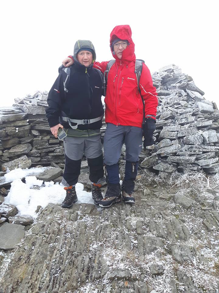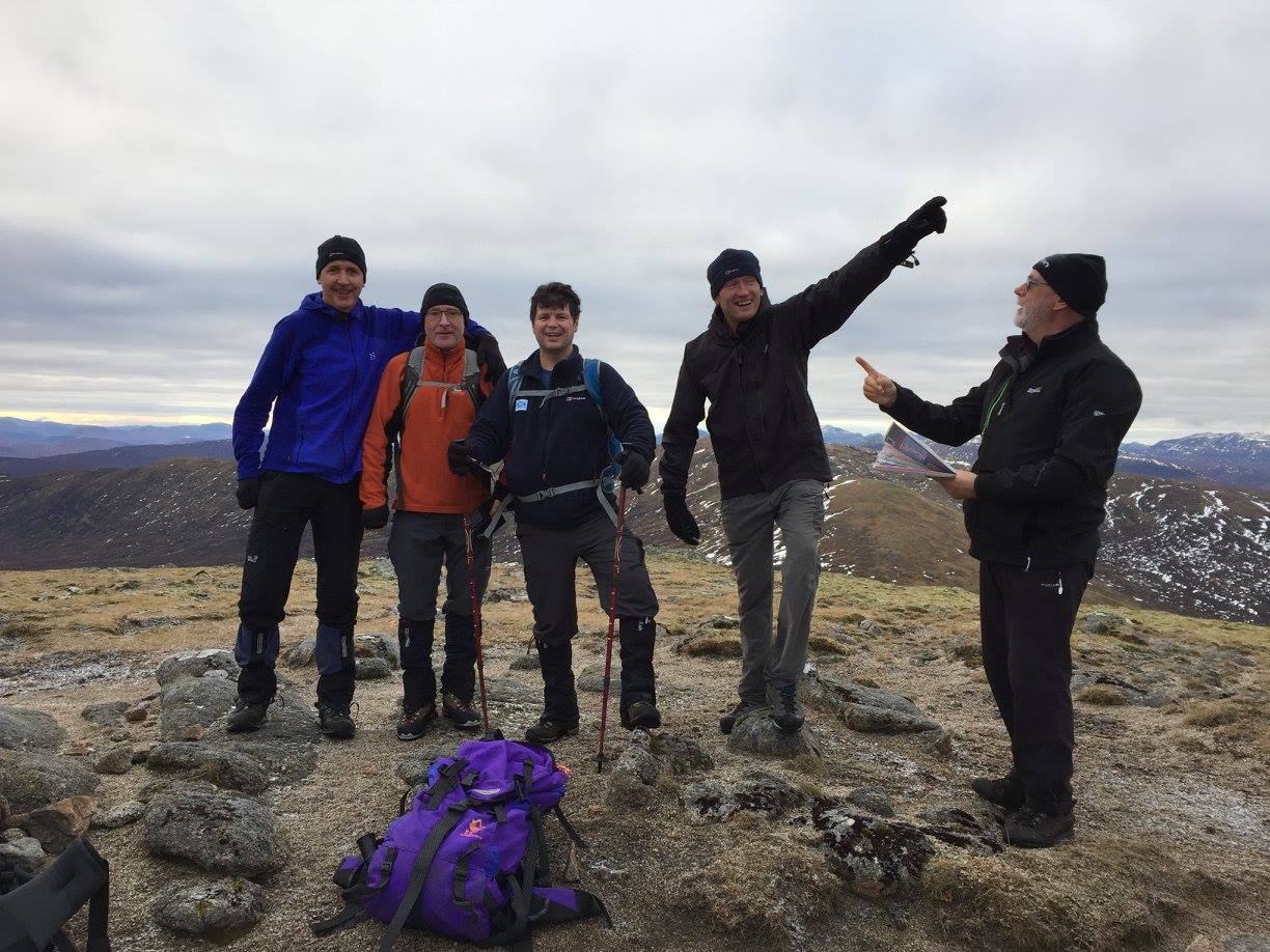 In the meantime, when Norrie was finally roused from slumber, he, Ian, James, Neil, Alan and Douglas set off for the same two Munros directly from the Hostel. A track was ascended to the memorial plaque at Peter’s Rock from where fairly easy angled slopes took them up to the summit ridge and the huge summit cairn.