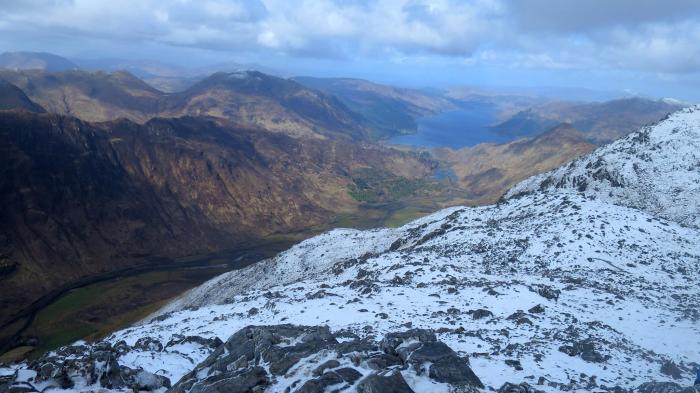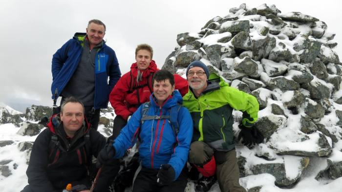 Half way along the ridge to the summit, a familiar sight approached them from behind. It was George and Susan whose boots were melting the snow as they scorched their way up the hillside. They had amended their initial plan due to the early morning conditions and tackled Ben Attow first by the conventional route, then descended before approaching the slopes of A Ghlas Bheinn. At least they would be able to report back to Debbie (who was enjoying a relaxing day back at base with Donna) that her family were all still breathing – albeit a bit more heavily than usual.
