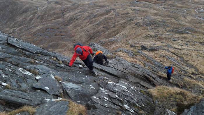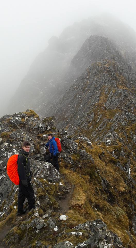 Raymond, James and Blair shot out of the blocks on the Thursday, heading up to Kintail to climb The Saddle and Sgurr na Sgine with their friend Jimmy Keen. The Forcan Ridge of The Saddle is one of the foremost ridge walks on the mainland and offers very enjoyable scrambling along it’s (at times) knife-edge spine – with bypass paths available for those who don’t fancy the a cheval manoeuvres. The conditions were decidedly murky but they enjoyed the scramble and the much more straightforward continuation to Sgurr na Sgine before their descent to the Kintail Lodge for supper and refreshment.
