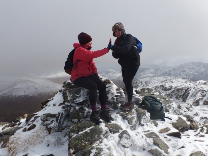 With Slioch eagerly leading the way, they headed up the glen and were duly recompensed by a distinct improvement in the weather conditions. Showing great moral fibre and true grit, Laura and Lanie insisted they would make it to the summit and were determined to press on. The overnight fall of snow though made the going a bit slippery and the knobbly switchback approach over the numerous false summits resulted in several moments of anguish as some unladylike language echoed round the glens.