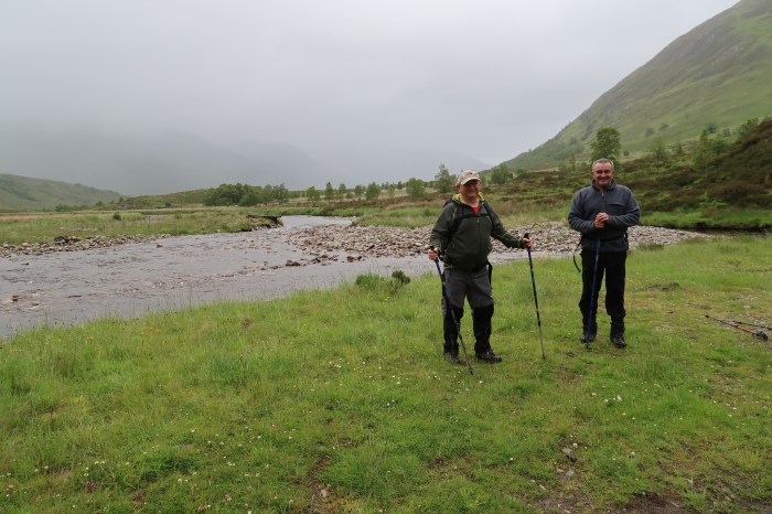 In the meantime, Paul, Norrie and Alan had set off from the hut in a south westerly direction up Gleann na Ciche with the vague intention of possibly climbing the nearby Corbett of Carn a Choire Ghairbh. It was clear though that the summit wouldn’t be – so they decided to leave the ascent for another time. There followed a not-quite-inspired idea to walk through to the Cluanie Inn and see how quickly they could reach the limit on Alan’s credit card. A quick look at the map proved that this was not really on, so an amble back to the hut was agreed instead.