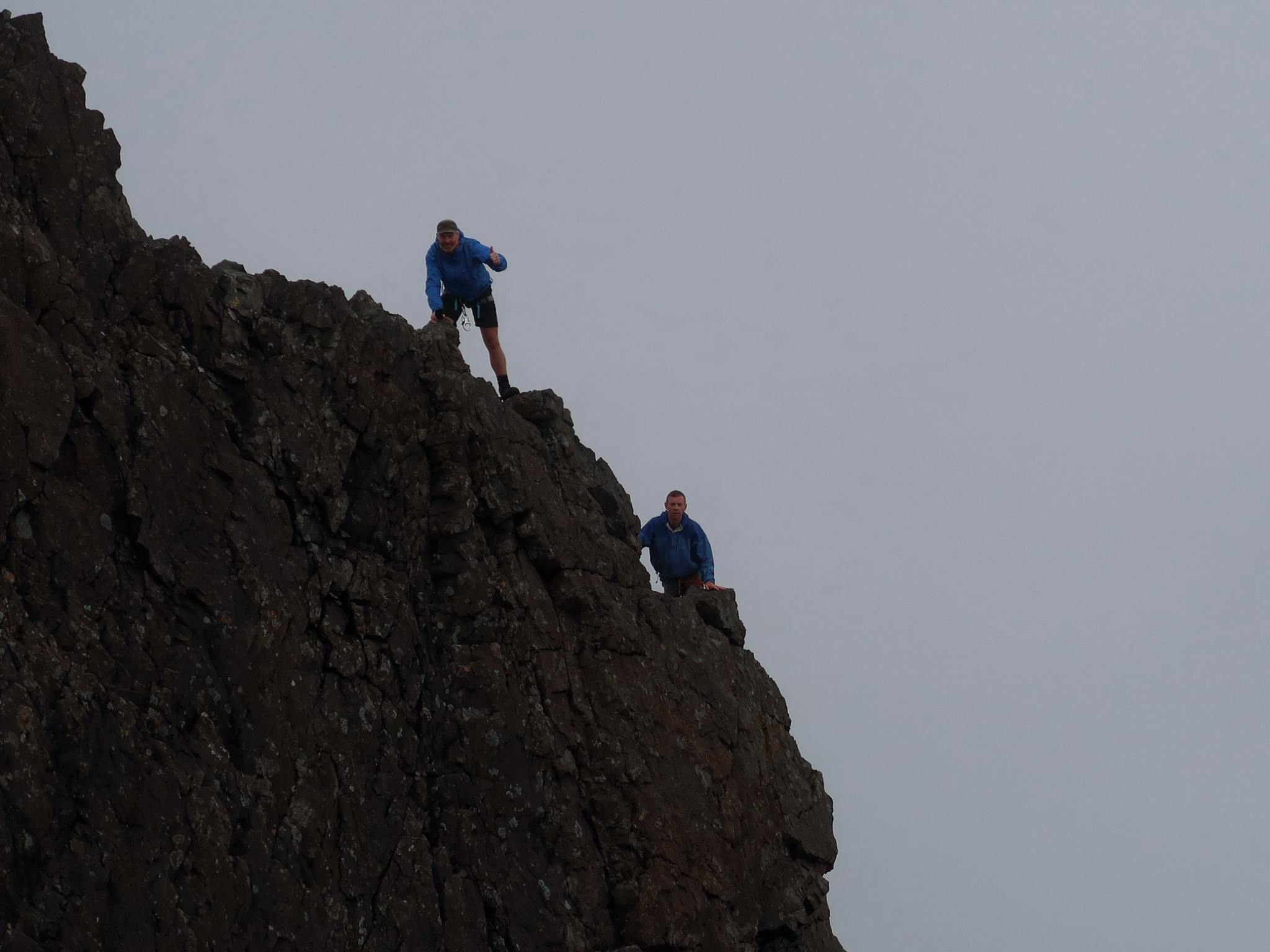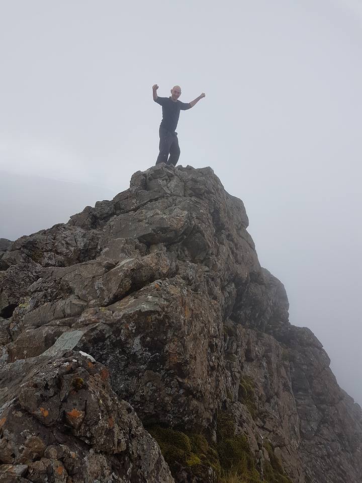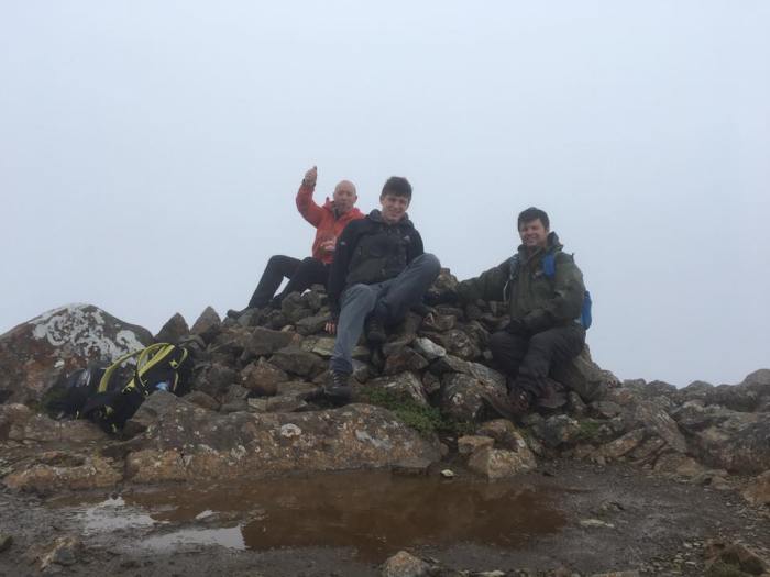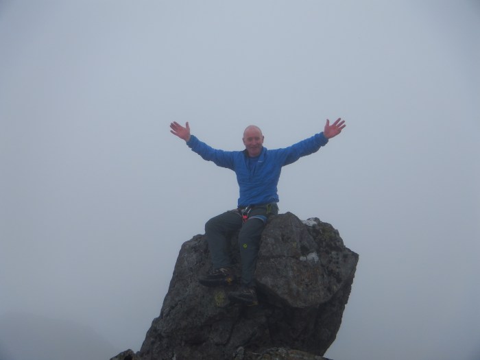 They set off in fairly decent weather, with clear visibility but as they headed up Coire Uaigneich the inevitable Skye misted descended and they were required to depend on their finely-honed navigation skills. They set a decent pace and before long they were sitting by the cairn posing gleefully for a summit photo.