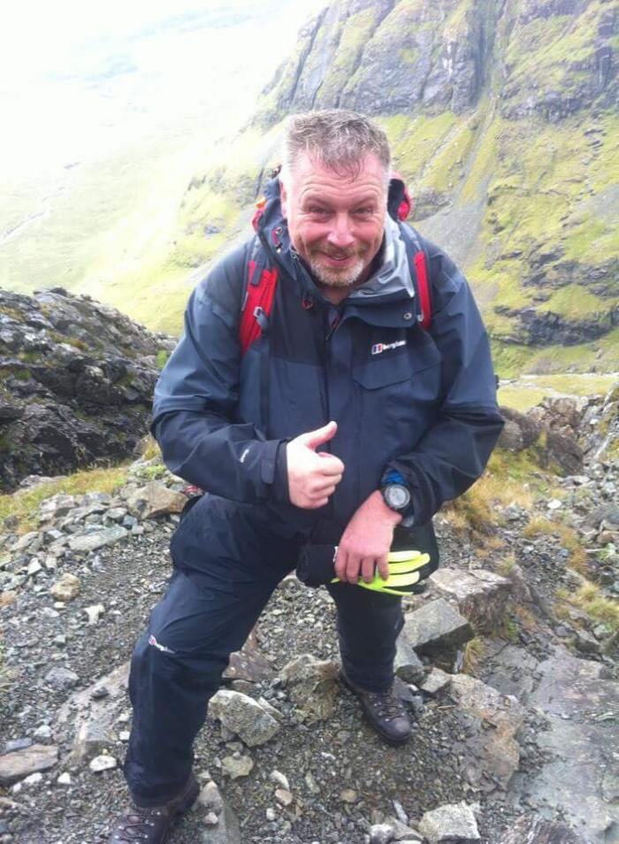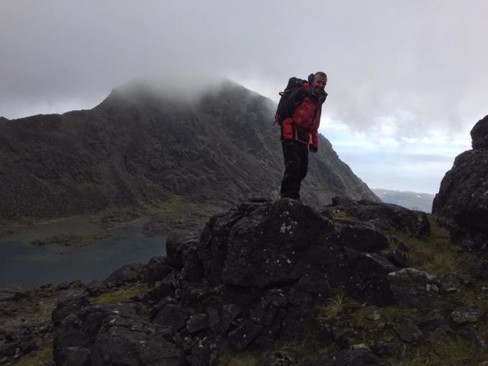Jason had harboured thoughts about going with the others to “take a look at” the InPin but decided it would be better to cut his Cuillin teeth on one of the other less exposed Munros. He and Susan therefore headed up from the hut straight up Coire nan Banachdich to the Munro of Sgurr na Banachdich. The going was fairly straightforward, in Skye terms, and this walk proved to be an excellent introduction to the Skye Munros for Jason. By the time he posed for a few photos on some outcrops he was in mountain goat mode and on his next trip will tackling some of the “big brothers” head on.