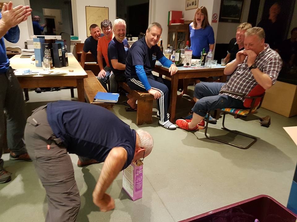 Before the inevitable singsong later in the evening, there was time for a few displays of fitness and athleticism, not to say facial contortions by various members. Norrie, aided by his wee short legs just managed the “pick up a cereal box with your teeth” challenge. However, despite game attempts by James and Jason nobody was quite able to climb over and under the dining table without touching the floor. Fortunately, the drop was a bit less than it is on the Cioch.