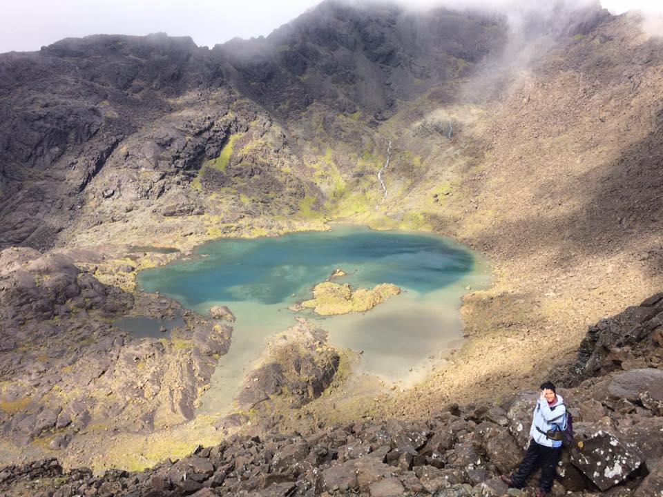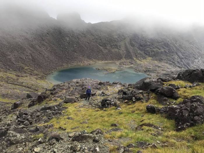 Jim, Michael, George and Susan continued their journey up from the Coir’ and southwards along the rocky ridge finally arriving at their intended summit. This was Michael’s first Cuillin Munro and he made a good show of appearing to enjoy it. The group though were rewarded with a momentary breaking up of the cloud as they were en route back down to the Coir’ and enjoyed some great views of the lochan.
