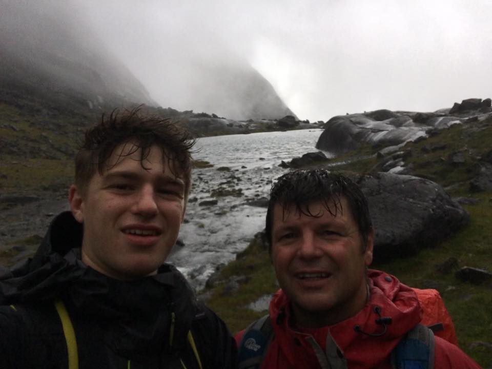 James and Blair had their sights set on the highest peak in Skye, Sgurr Alasdair and they headed off into the mist up to Coire Lagan and a gruelling ascent of the great stone chute which took them up to a short scramble away from their goal. No problems were encountered and they were elated to achieve their target before they splashed and slid their way back to the hut.