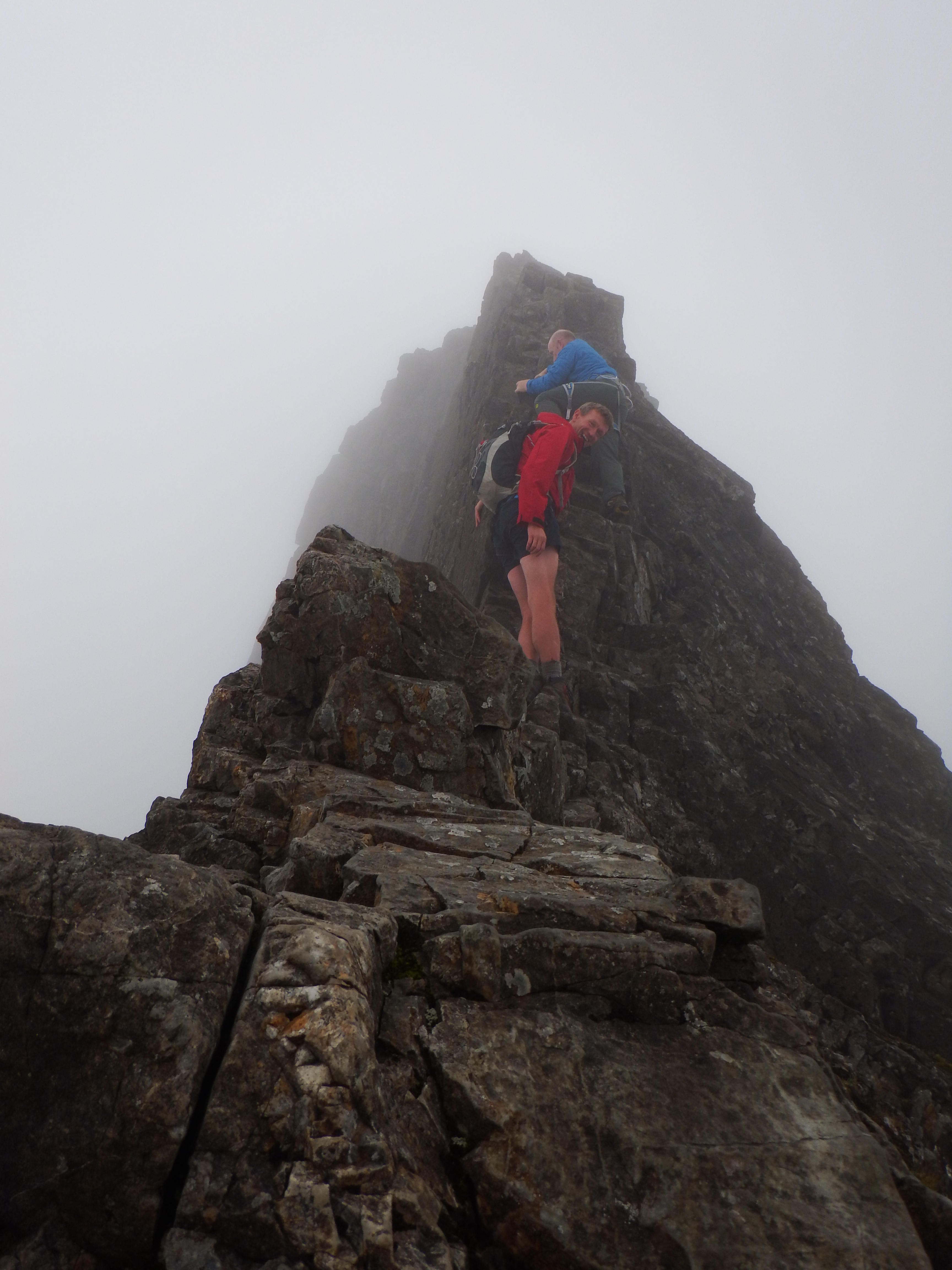 Finally, some decent weather arrived as Sunday dawned and the previous night’s plans were confirmed –  an assault on the InPin was about to take place. Norrie was particularly keen as this was the only Skye Munro he had not completed on his (possible) second round. Michael was also eager to give it a try fuelled by his experiences the previous day. Some gear was borrowed from Bill, and Raymond, Jim, Lorn, Norrie and Michael commenced the trek. Rather than take to the ridge they headed up into desolate Coire Lagan and trudged up the ponderous An Stac screes. They had perfect visibility most of the way up but the mist descended once again as they reached the bottom of the imposing tower. They only had four harnesses between them so Michael waited below, with Lorn holding back to keep him company while firstly Jim, then Raymond free climbed the infamous east ridge followed closely behind by Norrie.