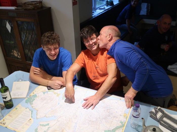 Once everyone was settled back at the hut on Saturday evening it became apparent that something was amiss. When photos of the weekends’ walks were being passed around it was clear that something was missing from the “summit” photo taken of Jim, James and Blair on Blaven. The trig point was nowhere to be seen. It became obvious on examination that they hadn’t actually reached the summit at all but had ended their ascent on the South Top – a few hundred metres from the actual summit with its tell-tale circular pillar. An animated post-mortem quickly followed with Jim and James throwing accusation and counter accusation at each other regarding who was to blame for their navigational blunder. Of course, everyone else in the party was full of empathy and compassion at the despairing prospect of them having to trudge all the way back to the true summit to claim their ascent. There were not too many tears of laughter and on occasion 10 whole minutes passed before in was brought up again. James also proved that not all t-shirt slogans are true!