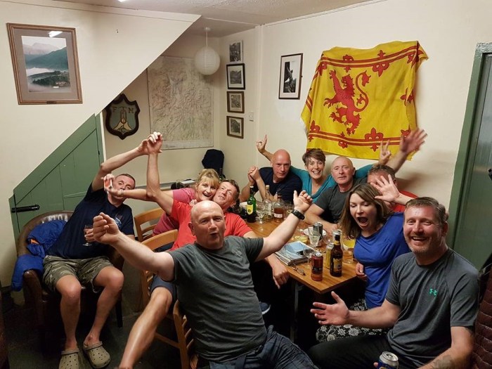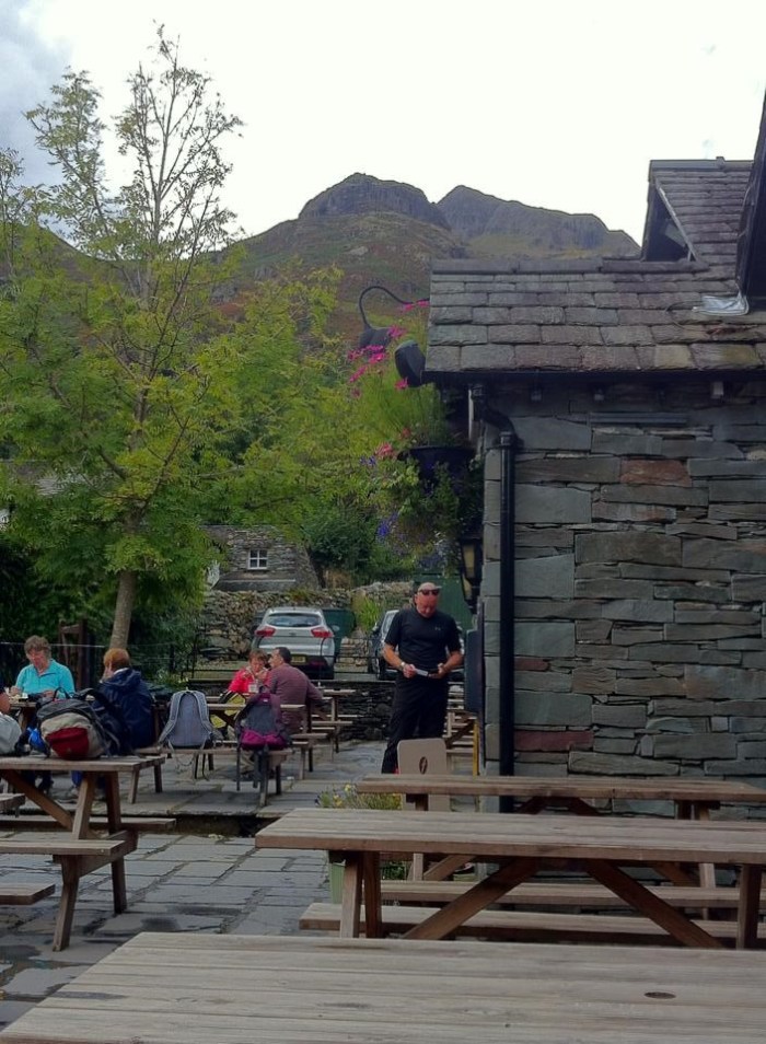 The next morning saw James, Gerry and Ian P. getting dropped off at Stool End up The Band to Bow Fell, Esk Pike, Great End to Scafell Pike returning by Angle Tarn and Russet Gill. This trio hoped that someone had received their message sent from the summit to be picked up at The Old Dungeon Gyll. Sure enough Jim Aire who had dropped them off earlier proved to be their saviour again. After a welcoming ale they were transported back along the white knuckle ride to Little Langdale, Jim cursing every inch of the way as the close proximity of the walls on one side and shrubs on the other put light scratches on his car, not serious damage and practically none earlier when a camper “lent” against him. Yet in another collision a car rattled his wing mirror. It was agreed by all that there was probably more danger in the country lanes than in the hills, with Jim driving at least.