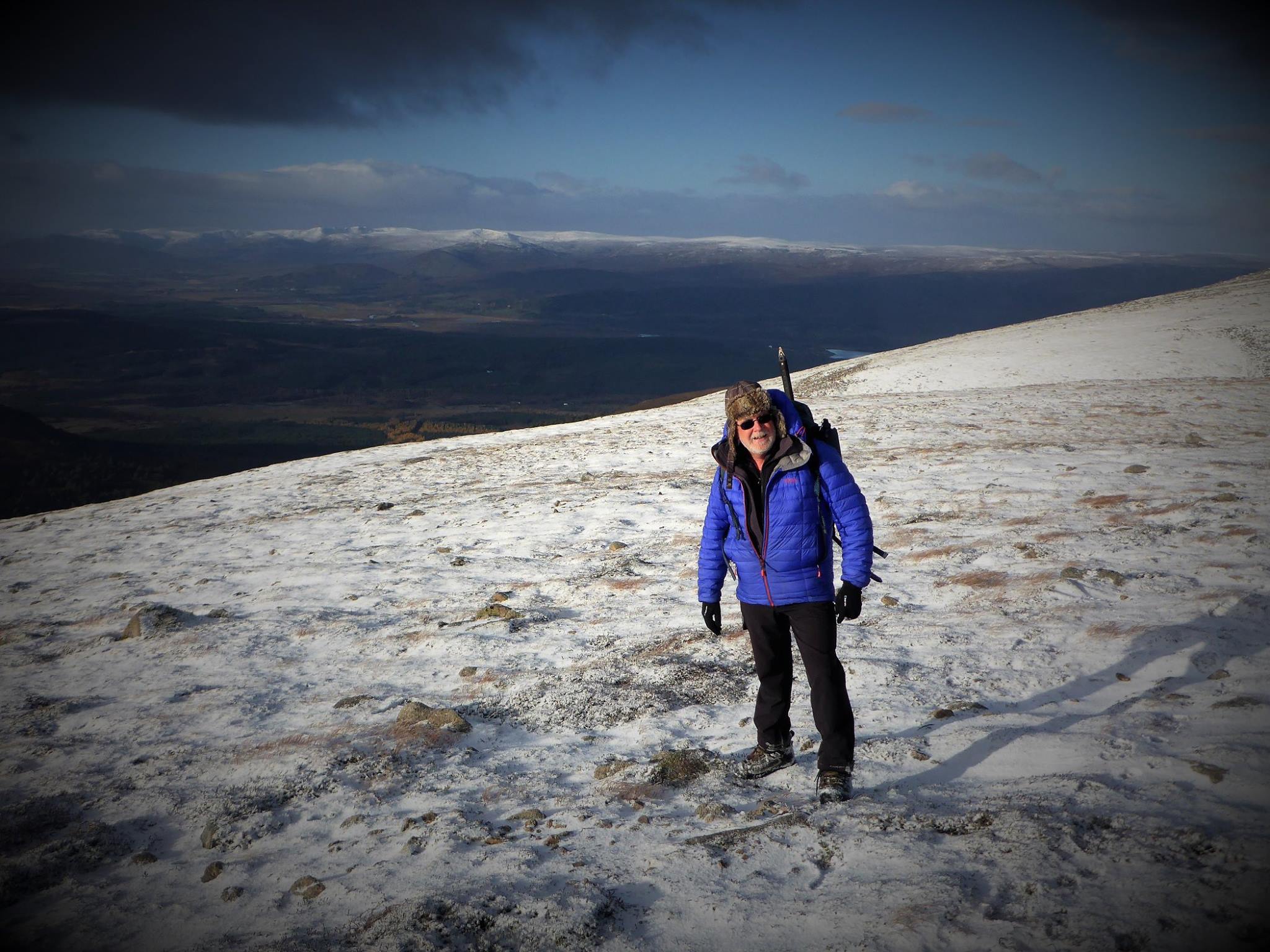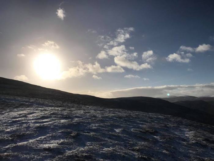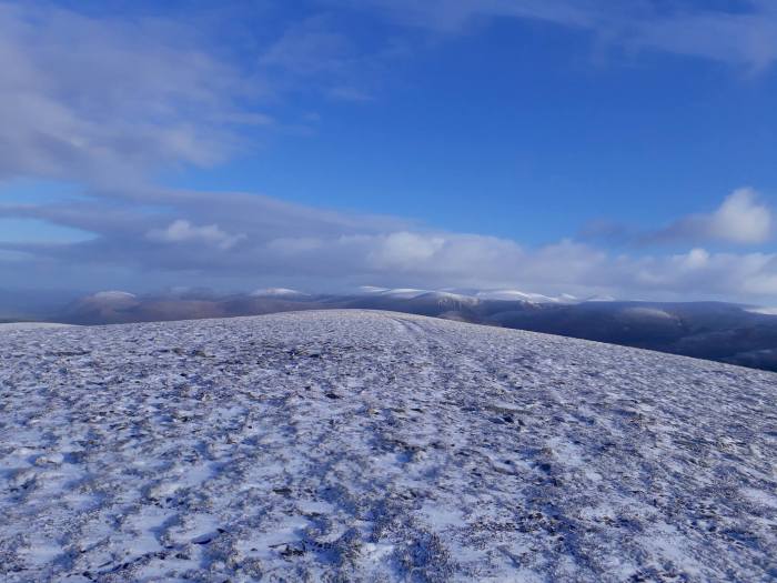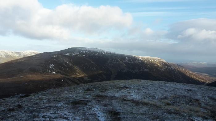 Raymond had taken his bike up with him and chose to cycle for 10 miles down Glen Feshie on the west side of the river. Despite the cold this was very enjoyable – well apart from the moment when his bike slipped on some ice and he took an acrobatic tumble along the road. Neither he nor the bike were seriously damaged fortunately and he continued down to the end of the glen before ascending the steep slopes of the Corbett, Carn Dearg Mor. From there he dropped a couple of hundred metres west before climbing again to another Corbett, Mullach Mhor, nearly 4k away from the first summit. As is often the case the views of the higher mountains from these slightly lower hills were magnificent.