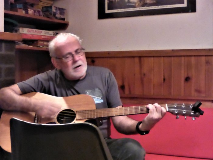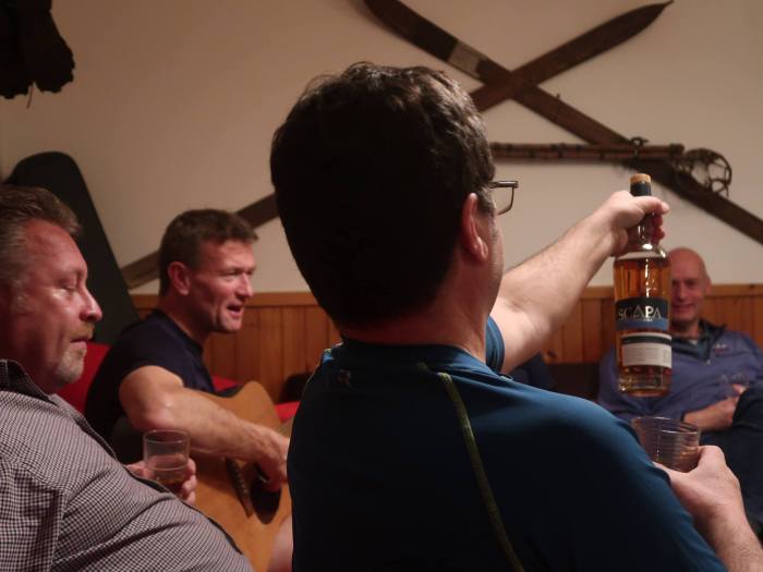 A very enjoyable evening was spent in the hut with the stove keeping everyone nice and cosy. Caroline and Javier were “treated” to a few songs by the 45 Degrees choir, led off alternately by Raymond and Norrie on guitar. Our European friends appeared to be enjoying the ambiance – but perhaps that was less about the music and more about the glasses of whisky that they were invited to sample. Later in the evening though it became clear that the excitement was just too much for Raymond and Lorn.