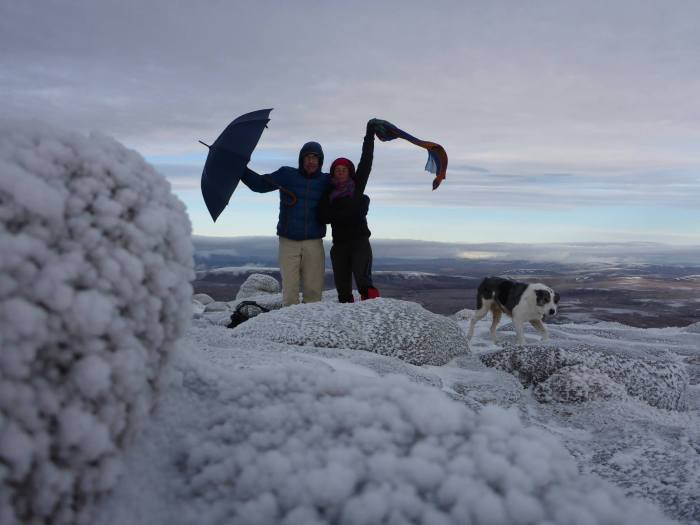 Caroline and Javier though were determined to make the most of their weekend and, having been bombarded with advice the night before, made a decision to head a few miles north to Glenmore Lodge and try their hand at the fine Munro, Bynack More. This involves an engaging walk past the well-named An Lochan Uaine – the Green Lochan before heading east then south up the steep snowy slopes of the 1090m Munro. Unburdened by Norrie’s funereal pace they made fairly short work of the ascent and celebrated with the usual photo-shoot. On this occasion though the managed to produce the first photo in 45 Degrees history of a summiteer wielding an umbrella.