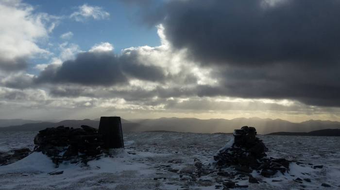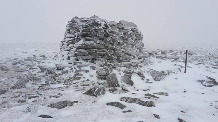 The weather on the Friday was not very promising and nobody chose to do any walking that day on the way up to hut. The exception was George who revisited the fine Corriehabbie Hill from Glen Rinnes on his quest to complete his 2nd round of Corbetts. He was fortunate enough to miss the worst of the weather as he arrived at the summit cairn with its peculiar capped trig point. He wasn’t long in scampering back down and managed to fit in a quick tour round the Cragganmore distillery before heading round to the hut to get the stove lit for the others arriving later.