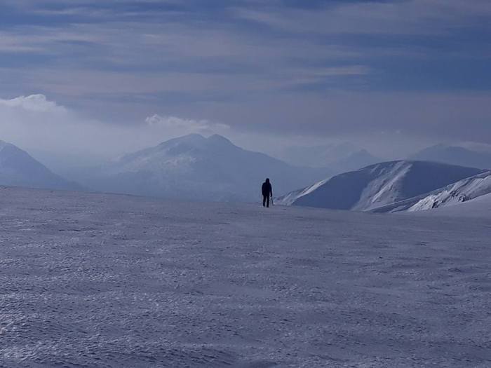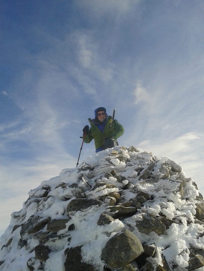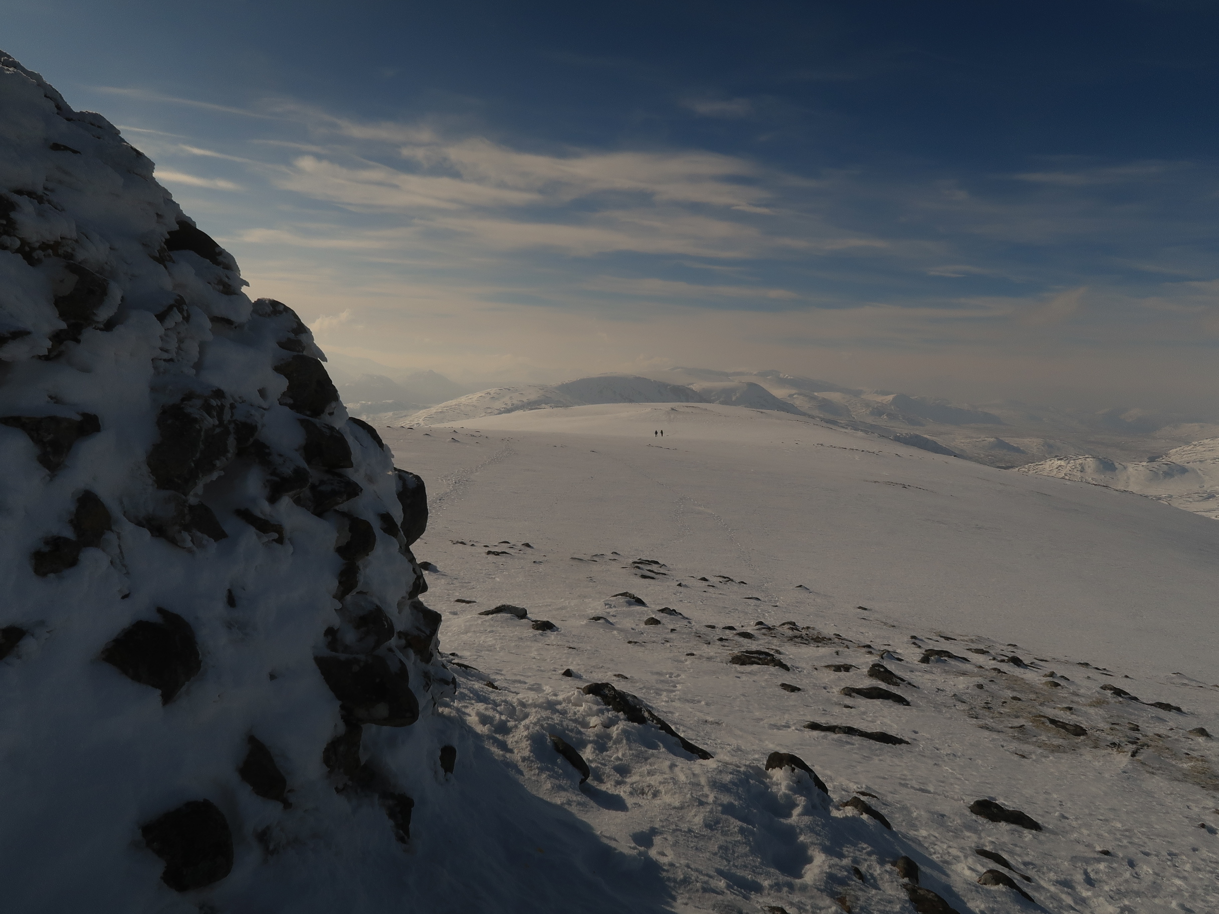 Once back on firm snow, the march proceeded north east up an even incline. Once on the summit plateau though, the glacial wind whipped up numbing the group to their very core. Highly unusually for Norrie his plod took him first to the summit cairn and he was greatly relieved that it was big enough to offer a bit of shelter from the penetrating blasts. James and Gerry had presumably stopped to do some shopping on the way up but eventually the pair could be spotted clumping over the ice-field towards the top of the hill.