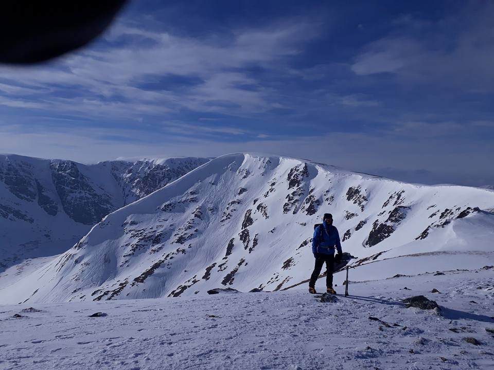 Not too much time was spent at the summit before they turned west and headed back down the Puist Coire Ardair ridge with great views down into the magnificent corrie of that name.