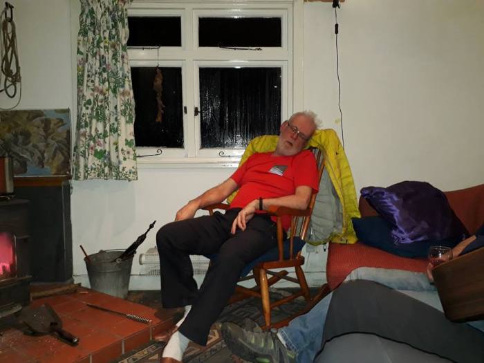 Back at the hut the gleeful mood continued and there were some impromptu auditions for next years “Strictly”, with Gerry’s hornpipe easily scoring a maximum 10 points from all the judges. It was all a bit too much for Norrie who slipped into deep repose shortly afterwards as a rejuvenated Gerry uncased the guitar and regaled the company with a few favourite songs.